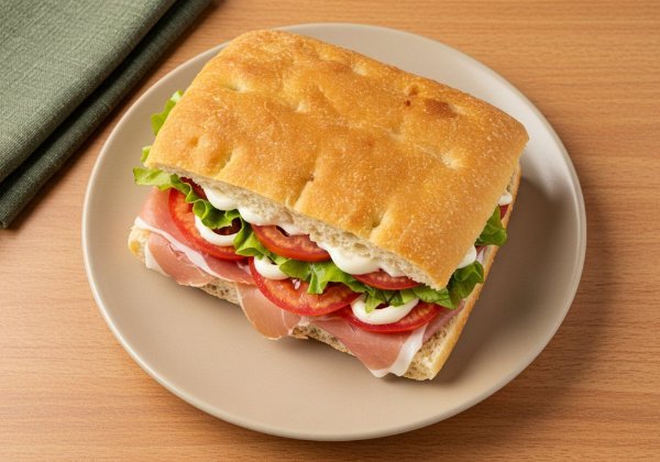 Sándwich en pan focaccia de masa madre, con una base de mix de lechugas, prosciutto, alioli y rodajas de tomate. Calorías: 435 kcal | Proteínas: 20.5 g | Carbohidratos: 54 g | Grasas: 17 g