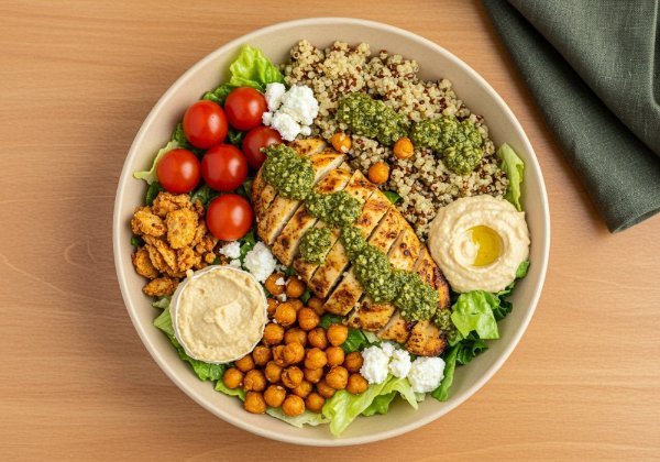 Ensalada a base de mix de lechugas frescas, quinoa especiada, pollo a la plancha con pesto, jitomate cherry, queso de cabra, garbanzos crocantes y un toque de hummus de berenjena. Calorías: 605 kcal | Proteínas: 45 g | Carbohidratos: 46 g | Grasas: 22.5 g