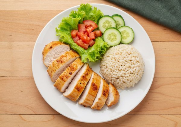 Pechuga de pollo asada (110 g) acompañada con arroz y ensalada mixta (180 g). Incluye limón, tortillas y salsa (aparte). Calorías: 565 kcal | Proteínas: 44 g | Carbohidratos: 88 g | Grasas: 6 g