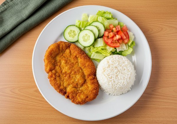 Milanesa de pollo empanizada (100 g) acompañada con arroz y ensalada mixta. Incluye limón, tortillas y salsa (aparte). Calorías: 630 kcal | Proteínas: 38 g | Carbohidratos: 91 g | Grasas: 14 g