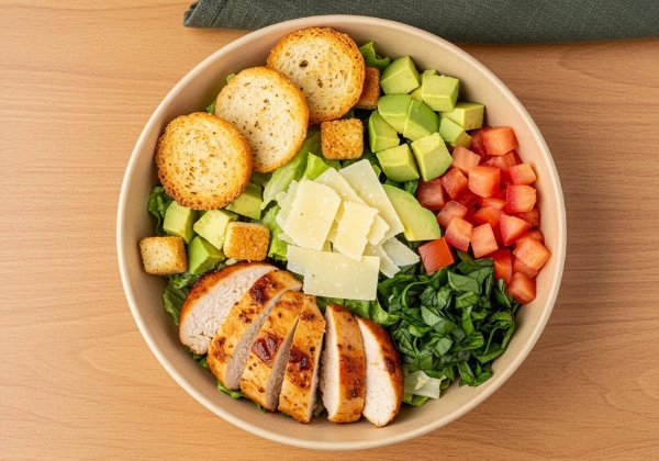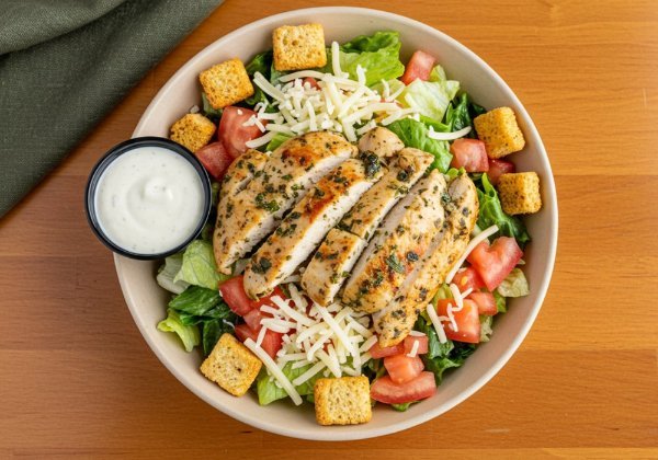 Ensalada a base de lechuga con pollo pesto, queso parmesano, jitomate y crutones. Calorías: 440 kcal | Proteínas: 38 g | Carbohidratos: 17 g | Grasas: 23.5 g