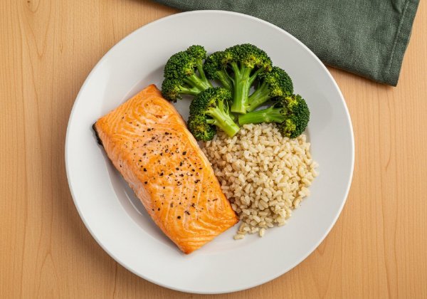 Salmón marinado en salsa Mongolian acompañado de arroz y brócoli rostizado. Incluye limón, tortillas y salsa (aparte). Calorías: 590 kcal | Proteínas: 36 g | Carbohidratos: 85 g | Grasas: 13.5 g