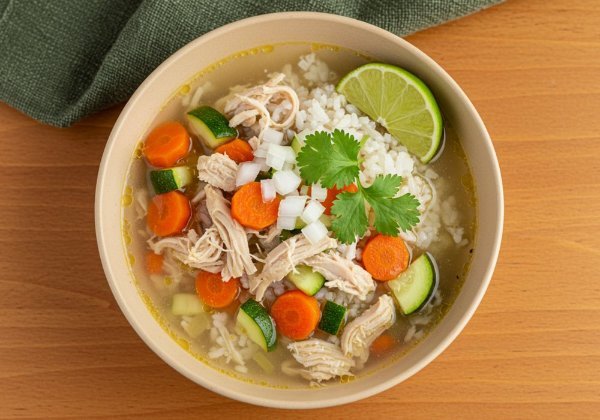 Consomé de pollo con trozos de pollo (35 g), arroz, zanahoria, zucchini, cebolla, cilantro y limón. Calorías: 110 kcal | Proteínas: 9.7 g | Carbohidratos: 14 g | Grasas: 1 g