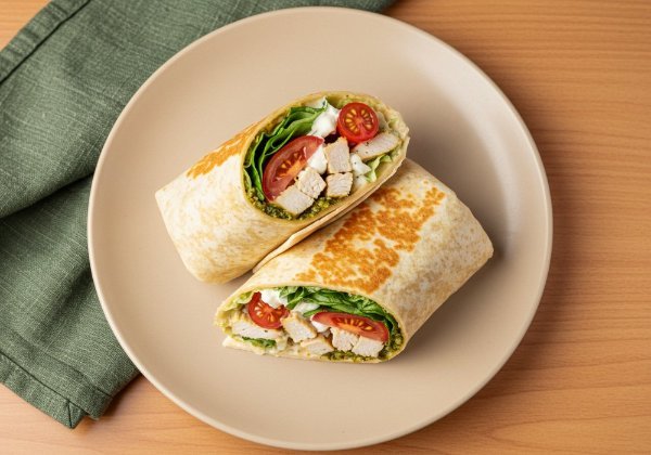 Wrap en tortilla de harina relleno con pollo pesto, queso mozzarella, jitomate, lechuga, crema y pesto. Calorías: 575 kcal | Proteínas: 42 g | Carbohidratos: 38 g | Grasas: 26 g