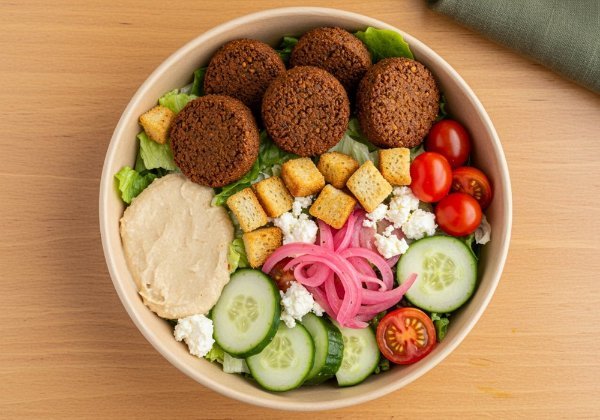 Ensalada con mix de lechugas frescas, falafel crujiente (5 unidades), pepino, jitomate cherry, queso de cabra, cebolla encurtida picante, hummus de garbanzo y crutones. Calorías: 565 kcal | Proteínas: 22 g | Carbohidratos: 55 g | Grasas: 27.5 g