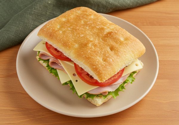 Sándwich en pan focaccia de masa madre, con una base de mix de lechugas frescas, alioli, jamón de pavo, queso mozzarella y rodajas de jitomate. Calorías: 485 kcal | Proteínas: 26.5 g | Carbohidratos: 54 g | Grasas: 19 g