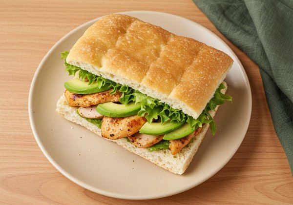 Sándwich en pan focaccia de masa madre, con base de mix de lechugas frescas, pollo jugoso, aguacate cremoso y alioli. Calorías: 580 kcal | Proteínas: 39 g | Carbohidratos: 55 g | Grasas: 23 g