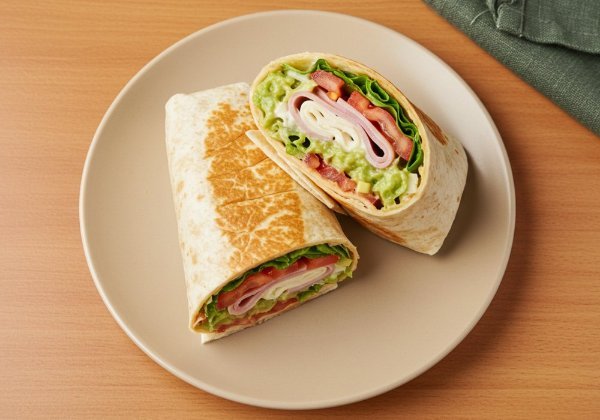 Wrap en tortilla de harina relleno con jamón de pavo, queso mozzarella, lechuga, jitomate, guacamole y alioli. Calorías: 455 kcal | Proteínas: 24 g | Carbohidratos: 39 g | Grasas: 21 g
