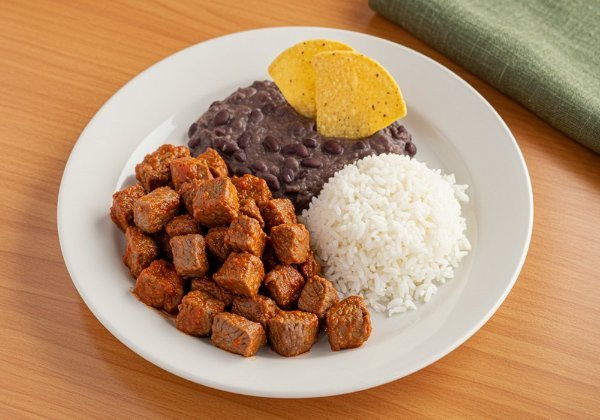 Arrachera (220 g) a la mexicana acompañada de frijoles y arroz. Incluye limón, tortillas y salsa (aparte). Calorías: 870 kcal | Proteínas: 67 g | Carbohidratos: 102 g | Grasas: 25.5 g