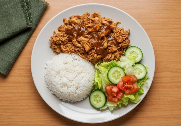 Pollo deshebrado en salsa BBQ (220 g) acompañado de arroz y ensalada mixta. Incluye limón, tortillas y salsa (aparte). Calorías: 680 kcal | Proteínas: 57 g | Carbohidratos: 96 g | Grasas: 9 g