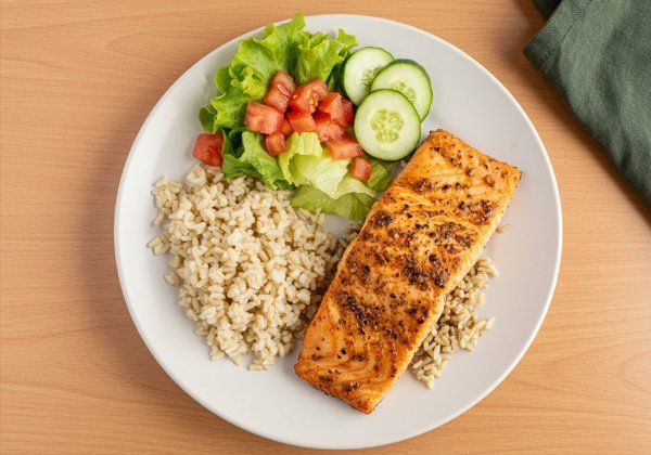 Salmón marinado en salsa pesto acompañado de arroz y ensalada mixta. Incluye limón, tortillas y salsa (aparte). Calorías: 600 kcal | Proteínas: 34 g | Carbohidratos: 88 g | Grasas: 13 g