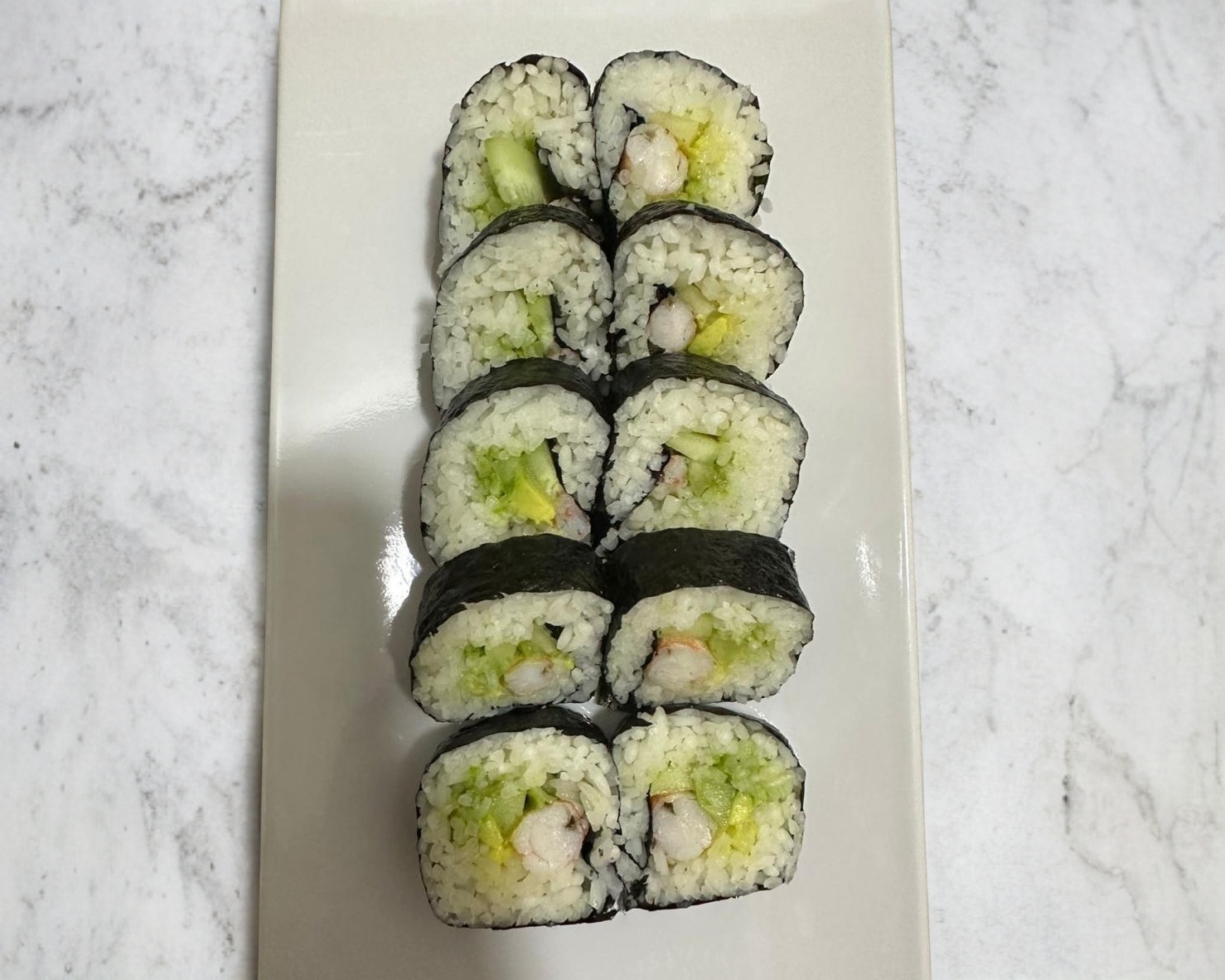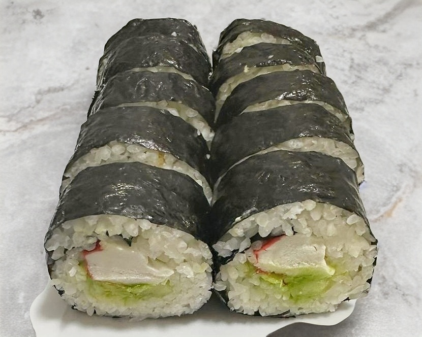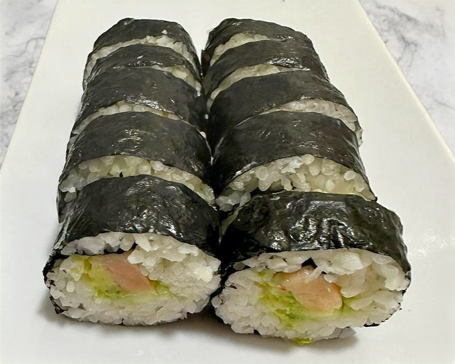 Rollo natural estilo maki con aguacate, pepino y surimi.