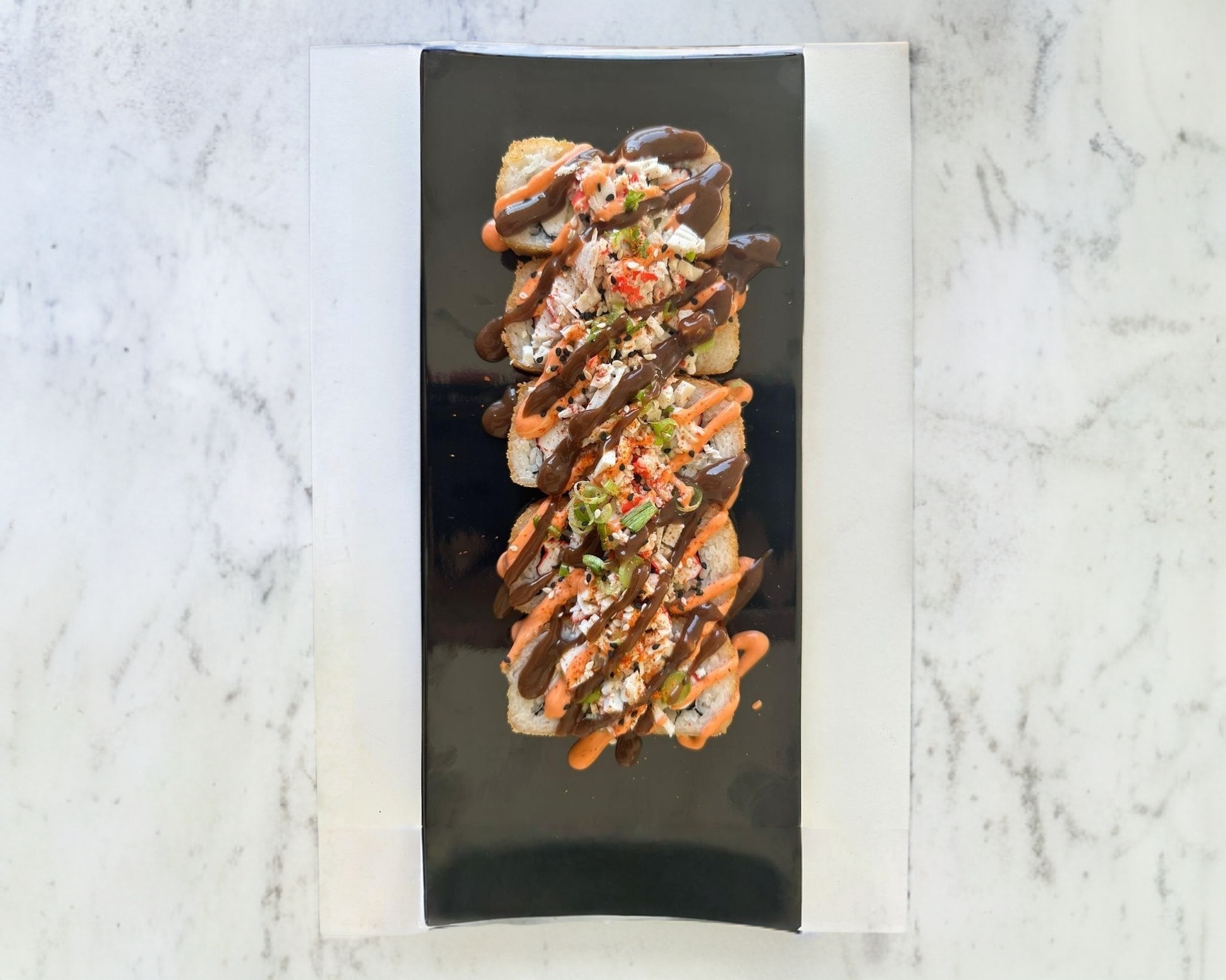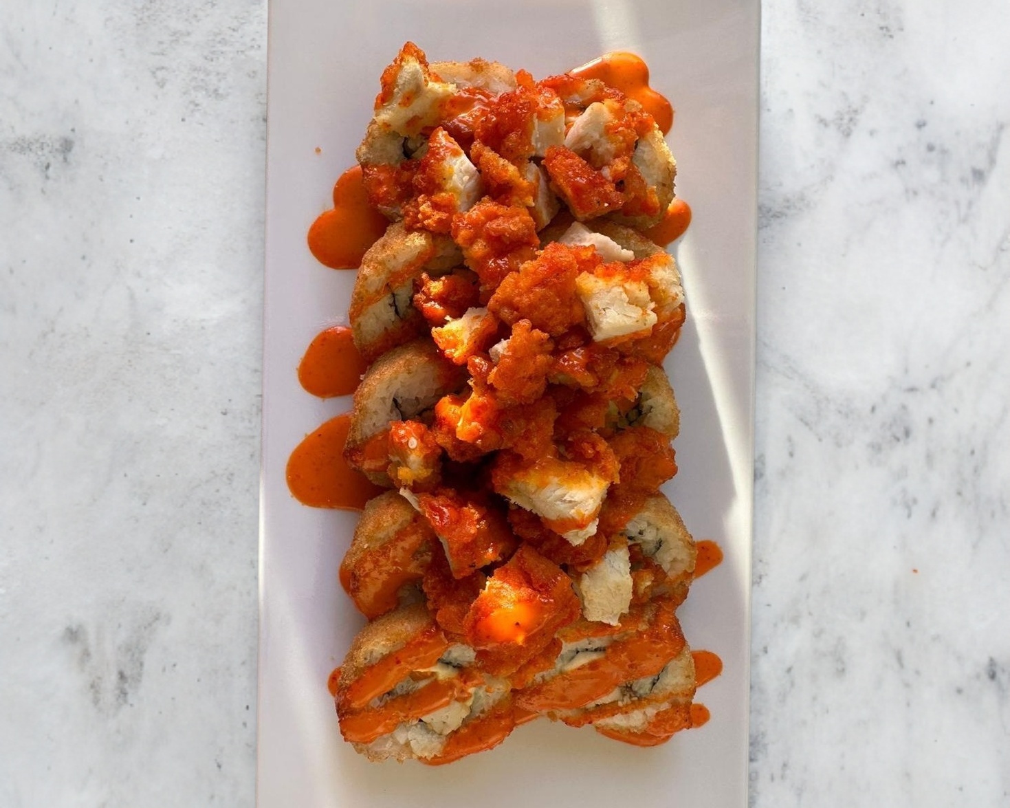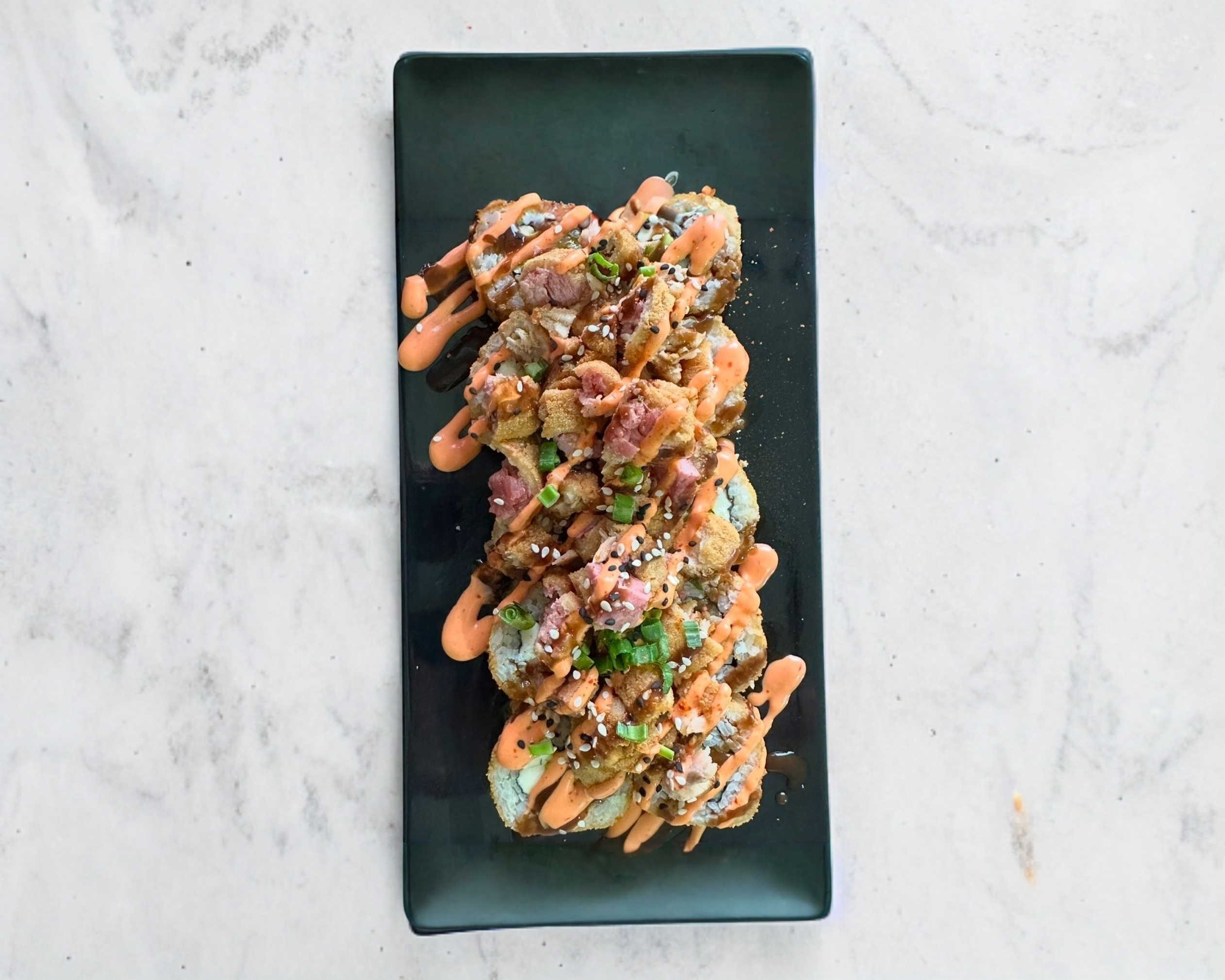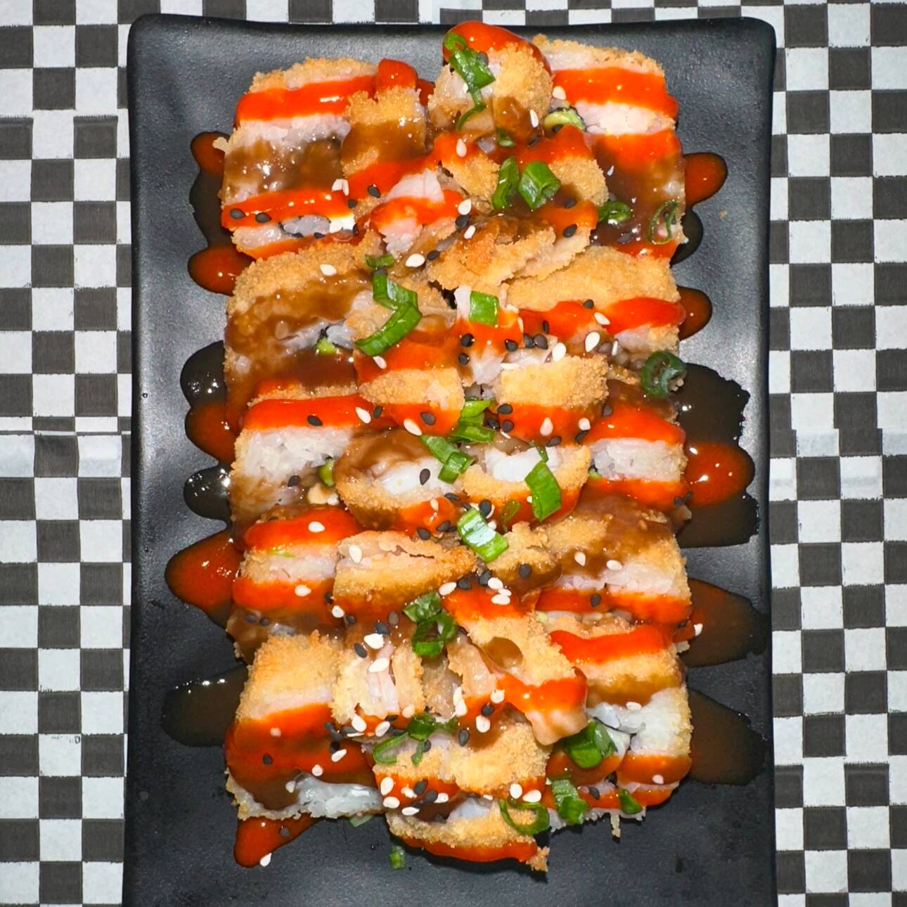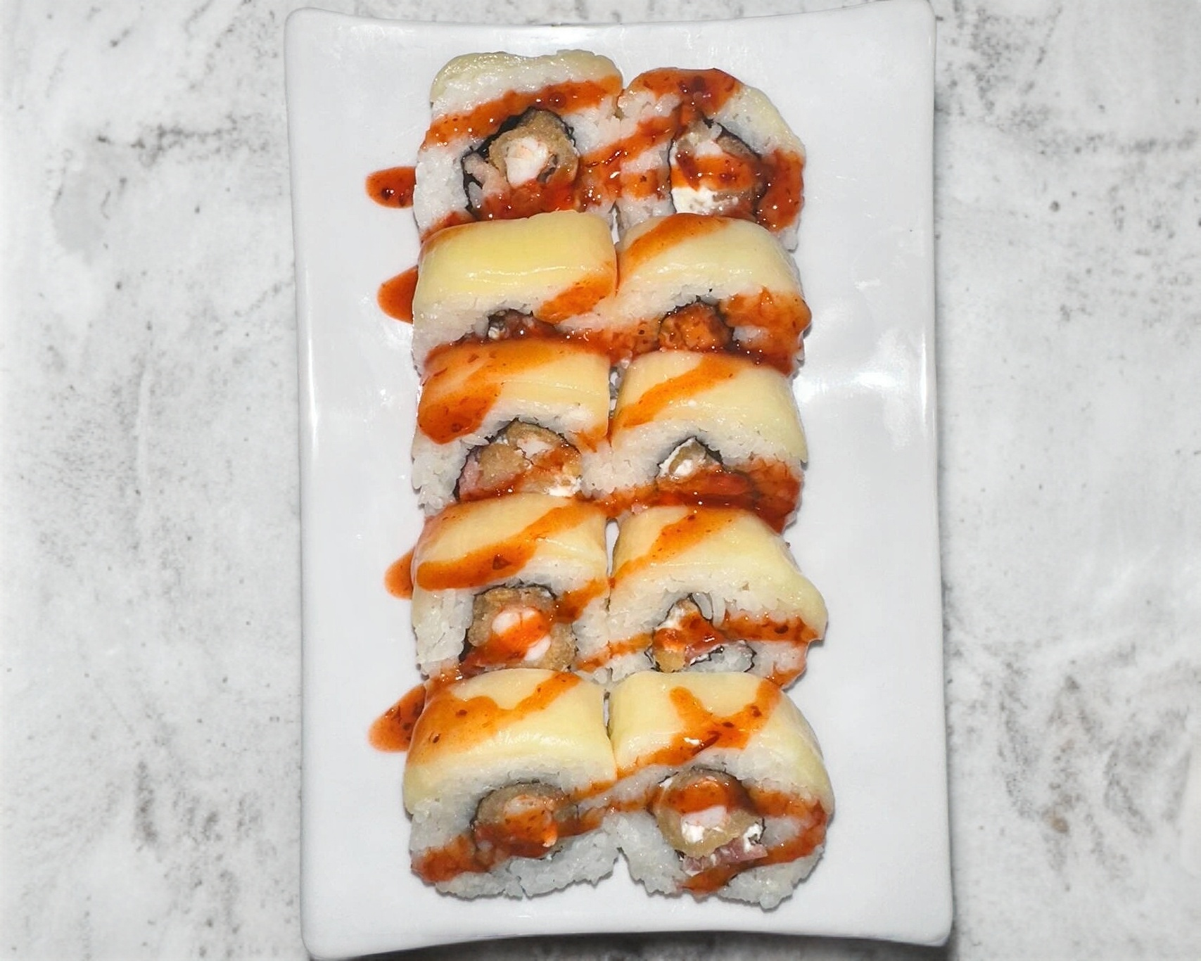 Con philadelphia, camarón y aguacate; camarón empanizado, cebollín y sichimi por fuera, bañado en salsas Sriracha y anguila.