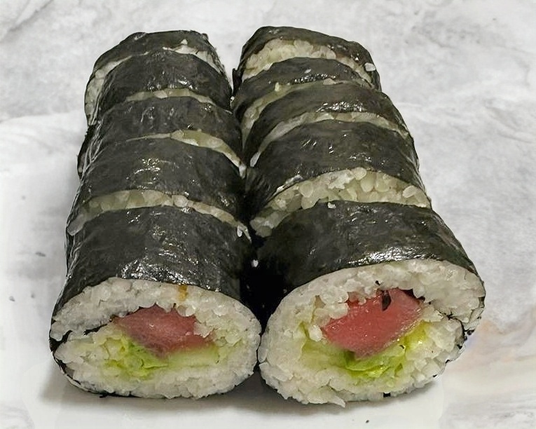 Rollo natural estilo maki con aguacate, pepino y atún.