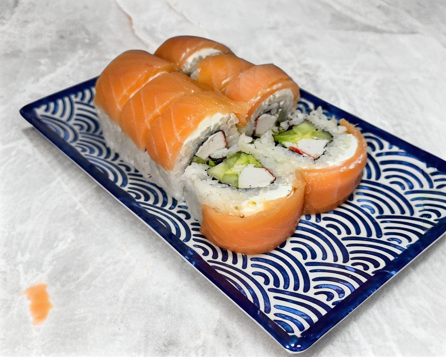 Con pepino, aguacate, surimi; Philadelphia y salmón por encima, bañado en salsa anguila.