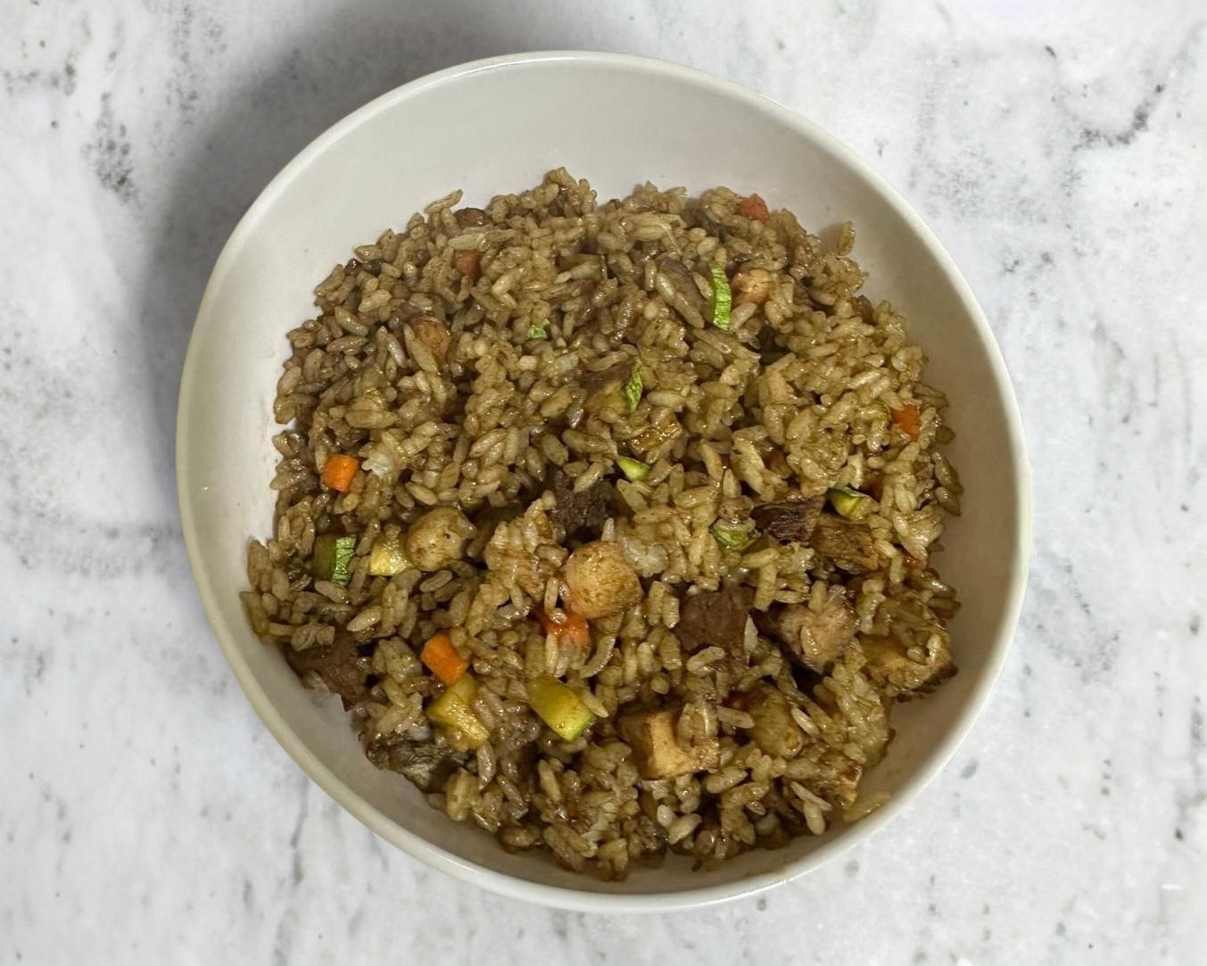 Arroz frito; mezclado con calabaza, zanahoria, res, pollo y camarón.