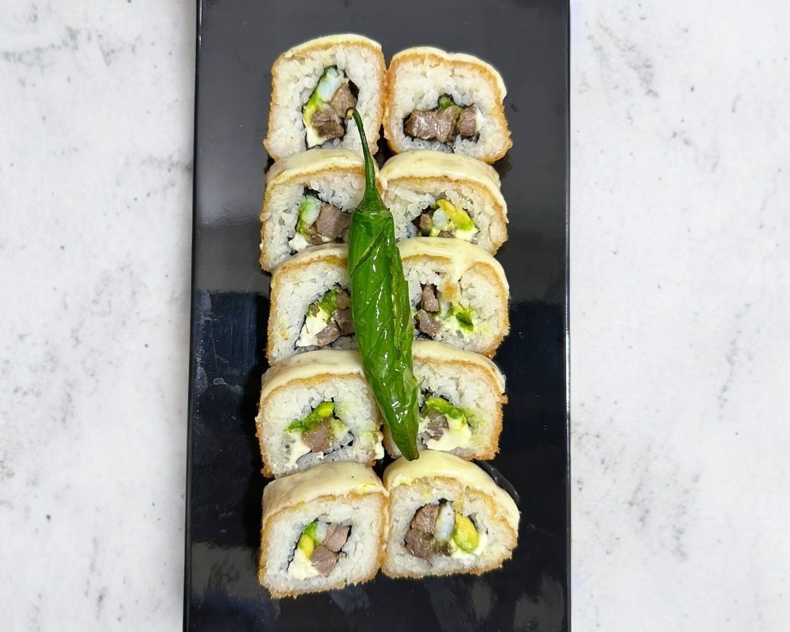 Con philadelphia, aguacate, res y camarón; queso manchego acompañado con un chicle toreado por encima