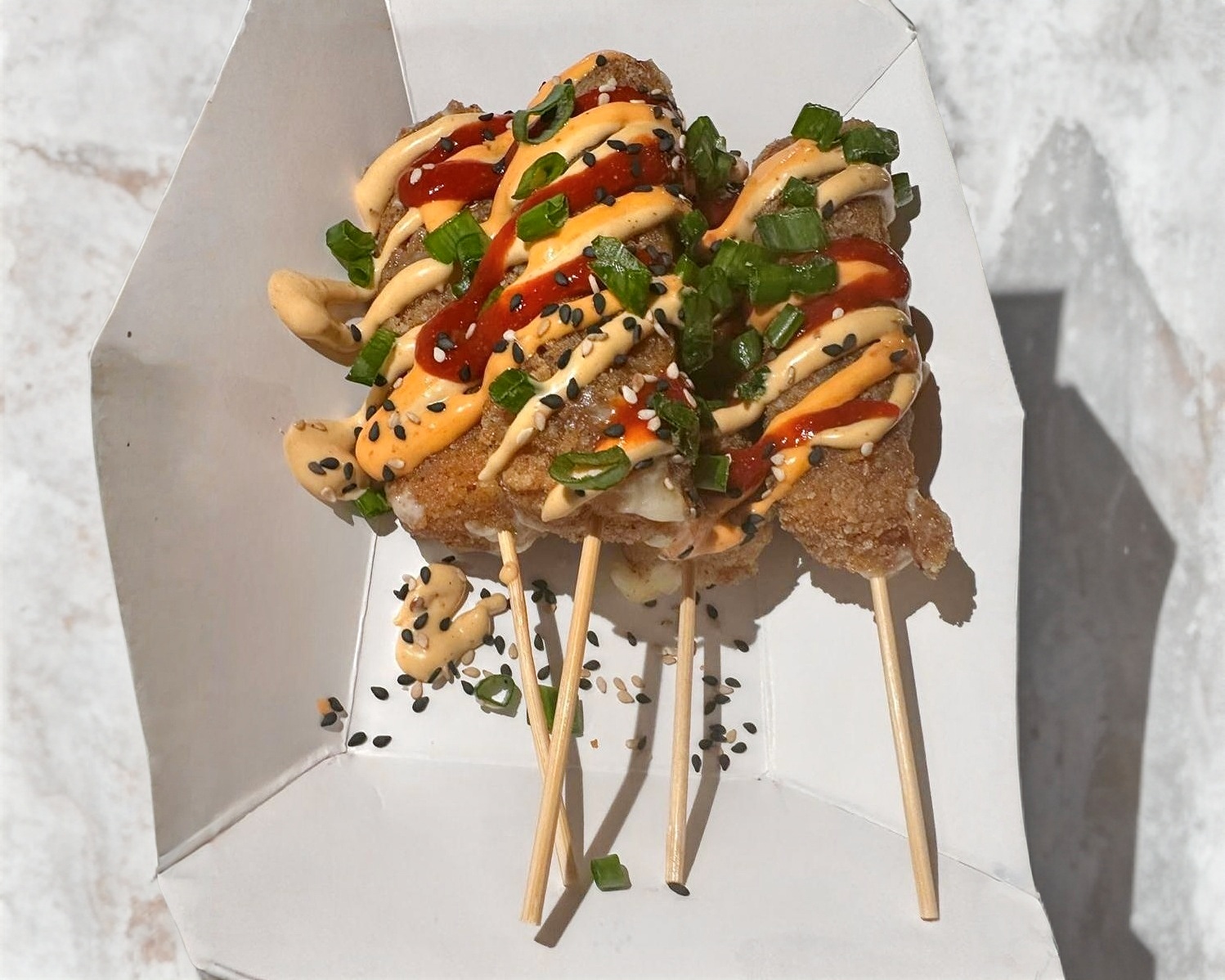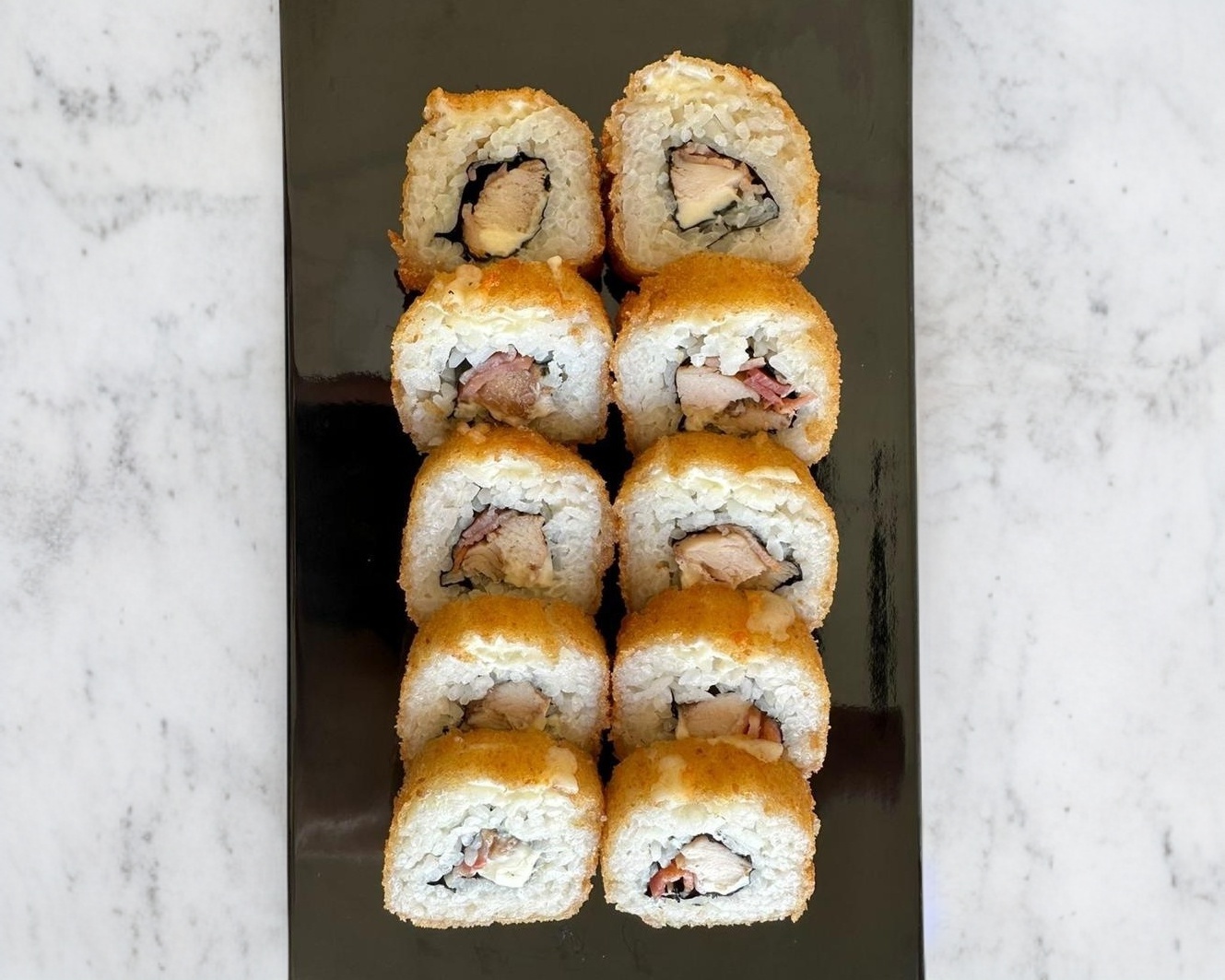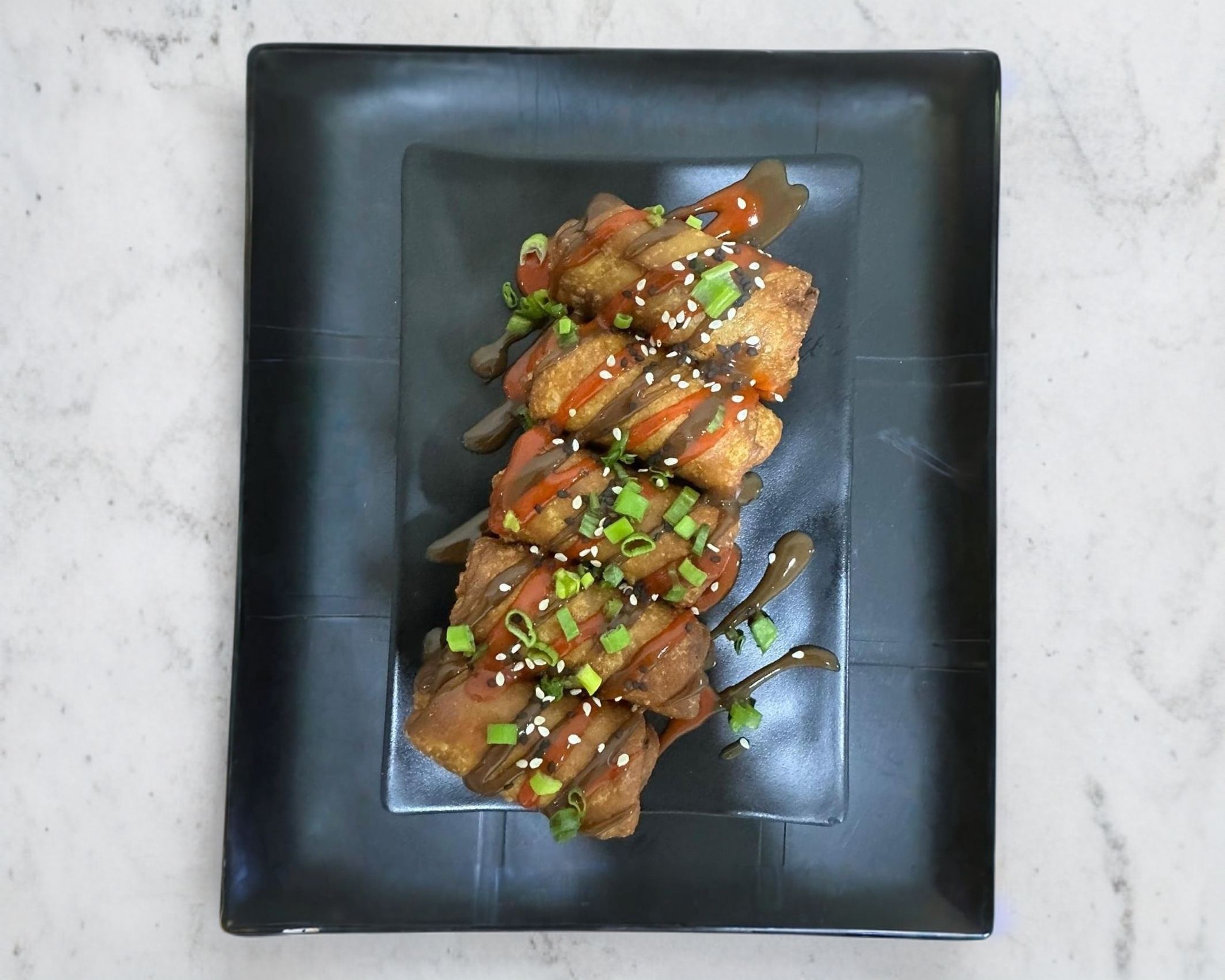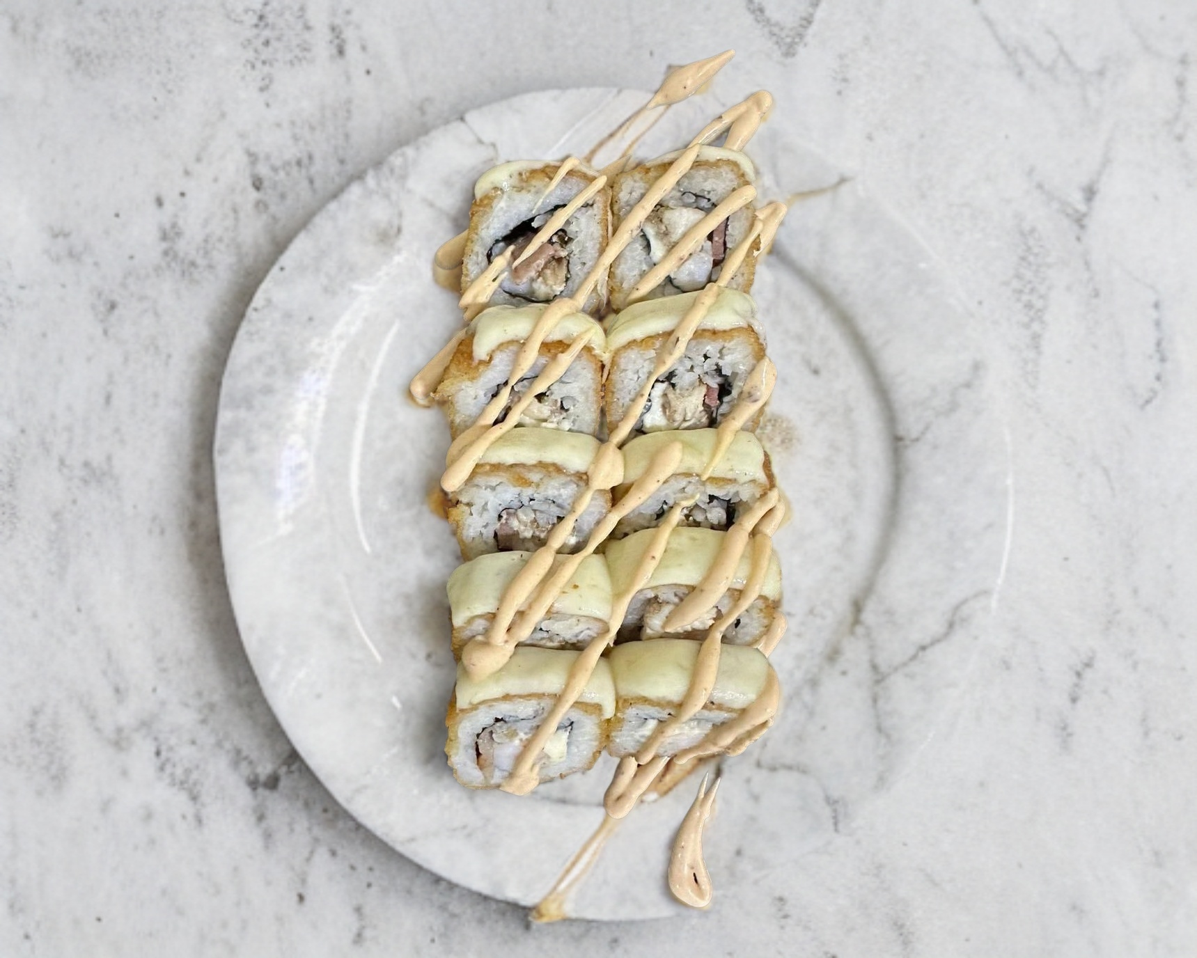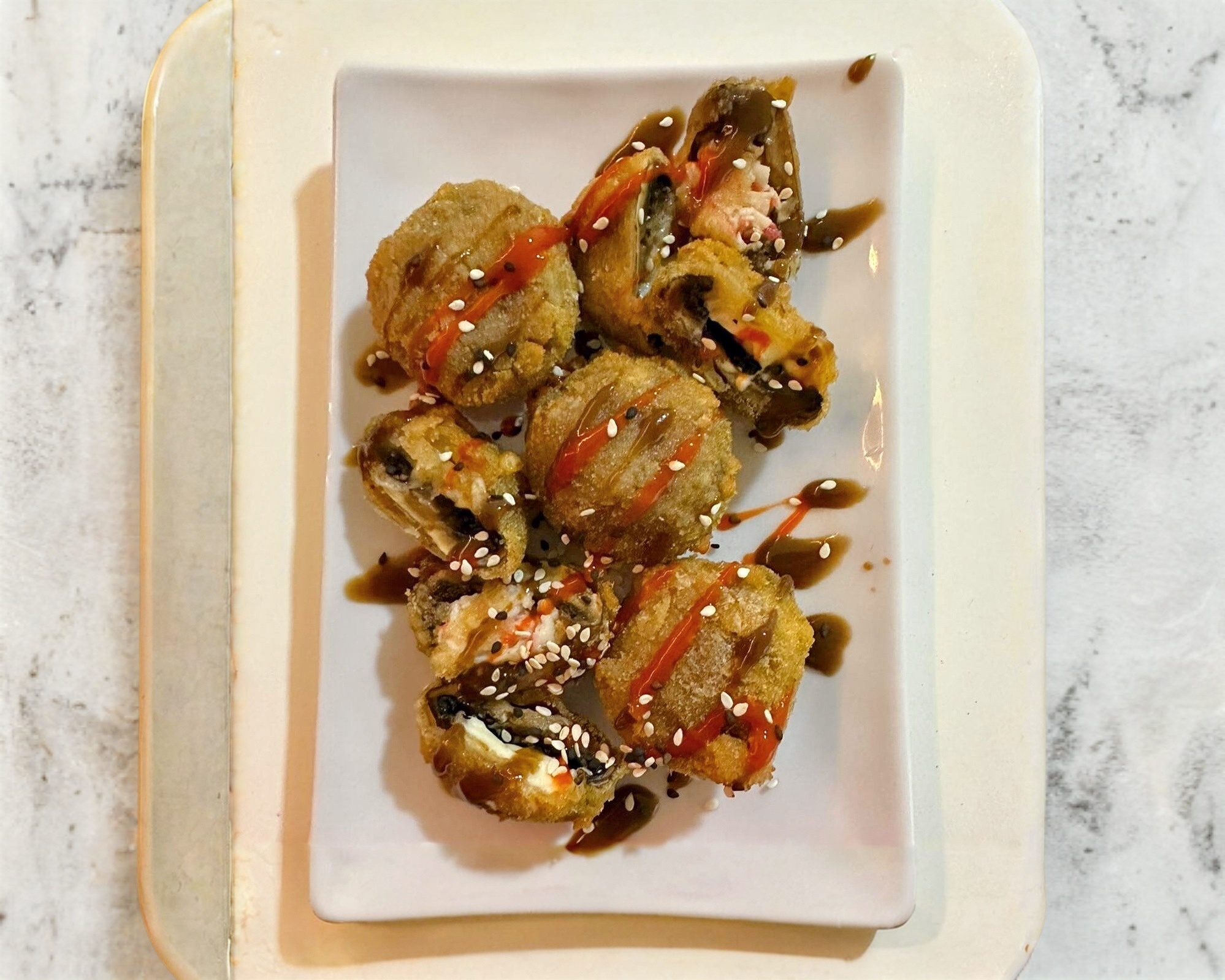 Arroz al vapor; una porción de philadelphia, un ingrediente empanizado a elegir, bañado en salsa Tatsu, salsa anguila, cebollín, ajonjolí, sichimi y aguacate.