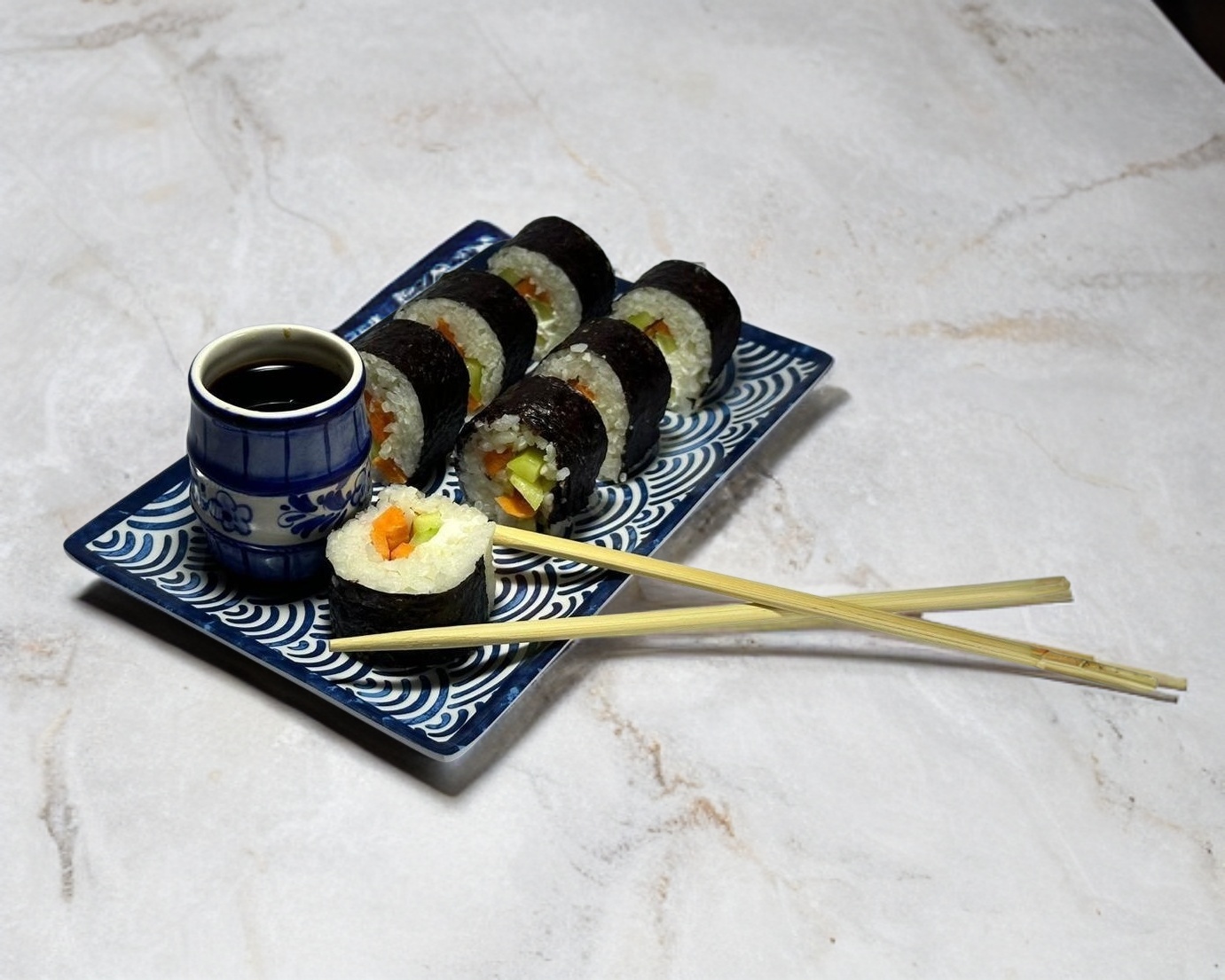 Rollo natural estilo maki con philadelphia, pepino y zanahoria.