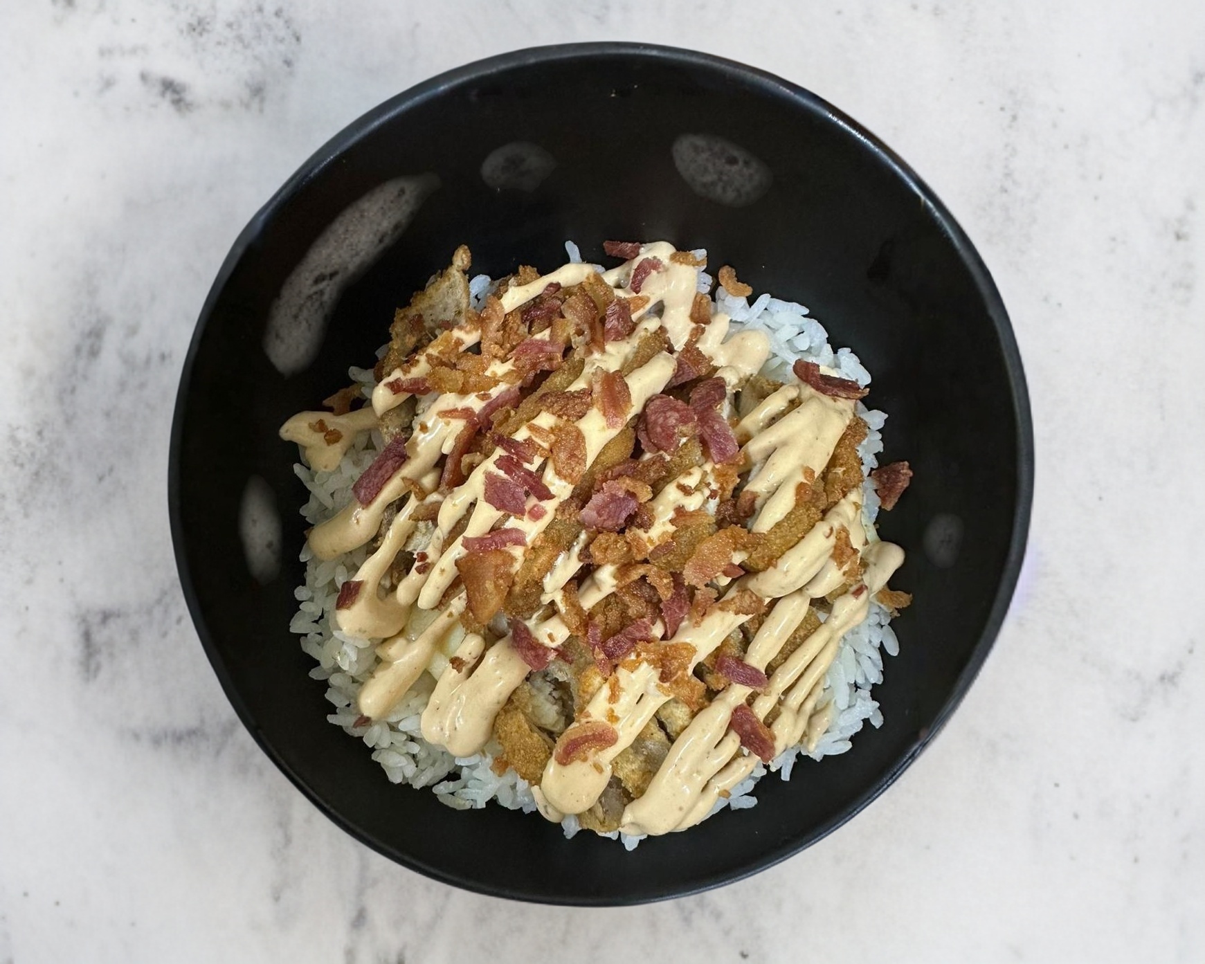 Arroz al vapor; Una porción de philadelphia, queso manchego gratinado, tocino, pechuga de pollo empanizada bañada en mayo-chipotle y ajonjolí.