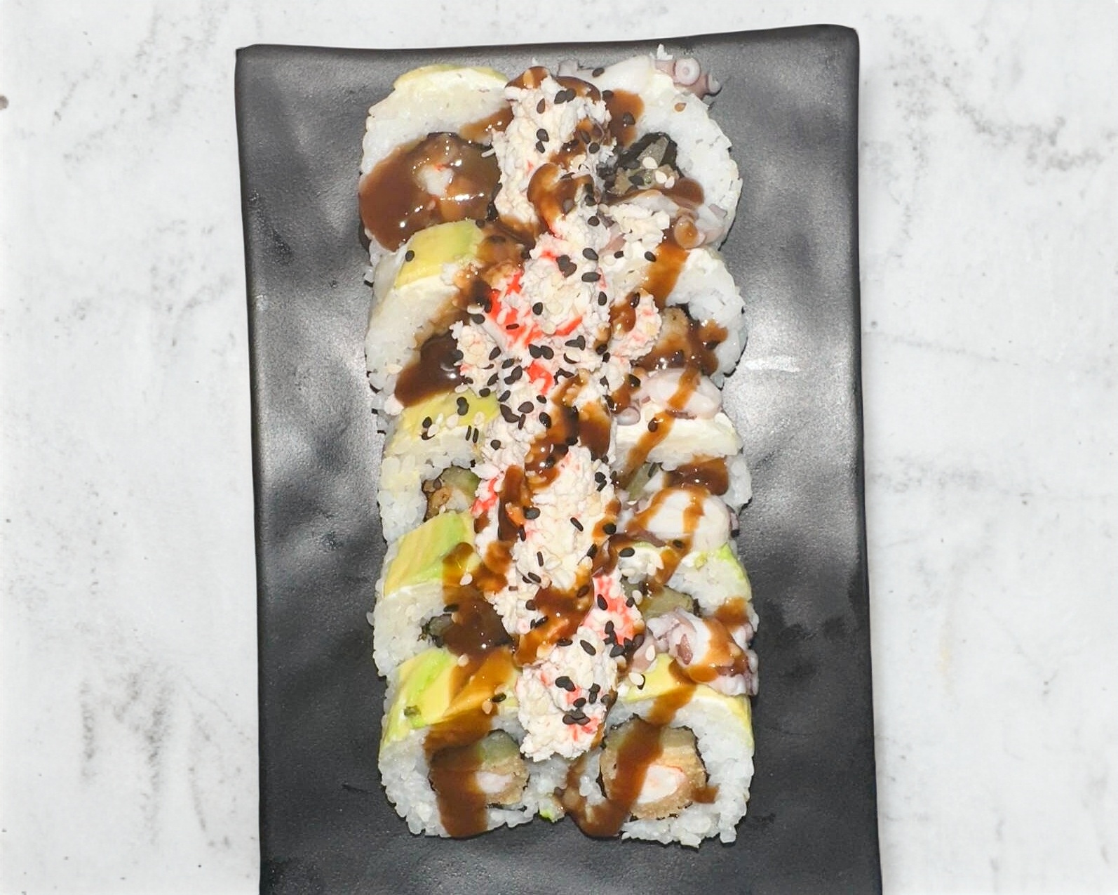 Con pepino y camarón empanizado; philadelphia, aguacate, pulpo y tampico, ajonjolí, bañado en salsa anguila.