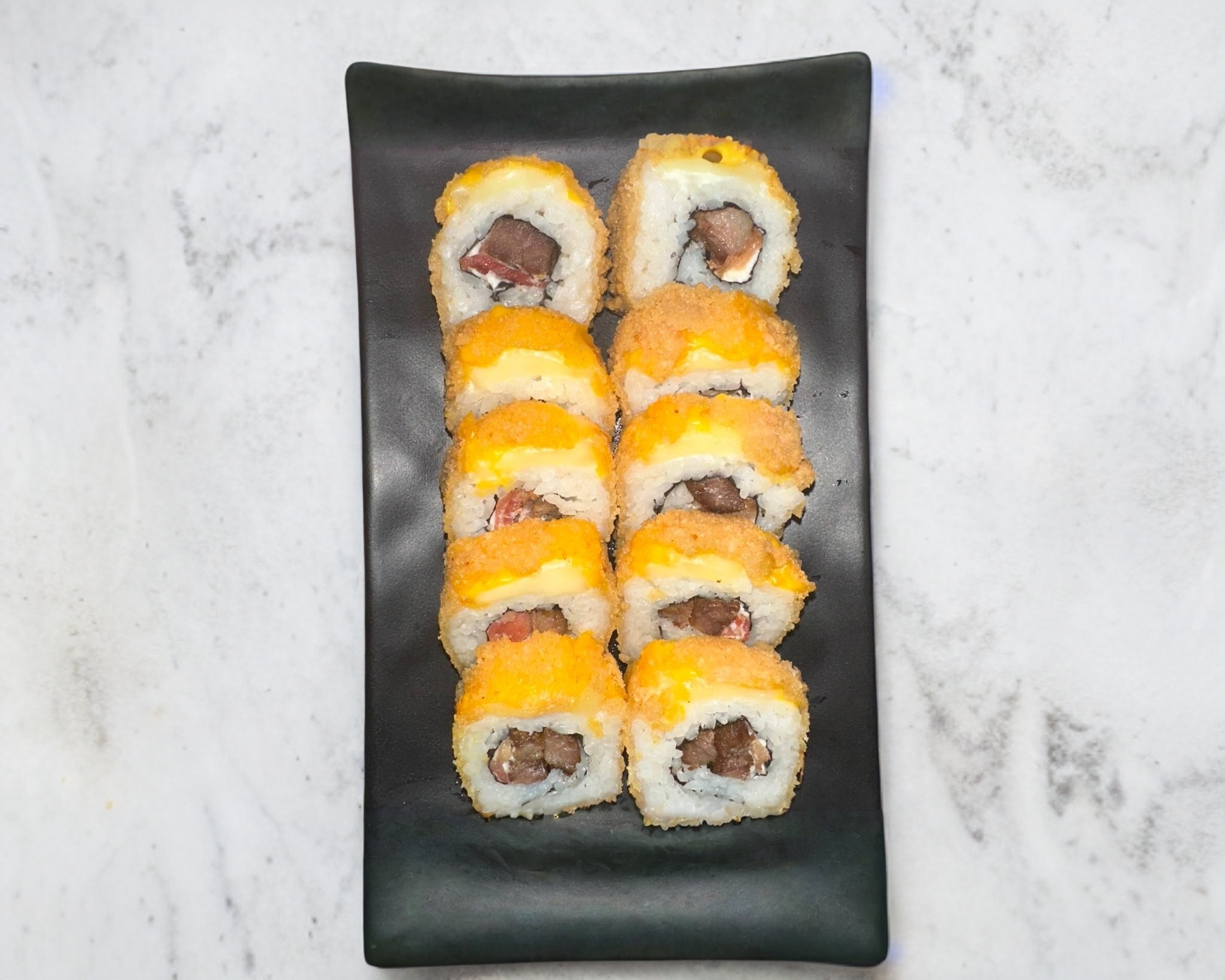 Con philadelphia, aguacate y pepino; salmón y atún empalizados por fuera, bañados de salsas Tatsu y anguila.