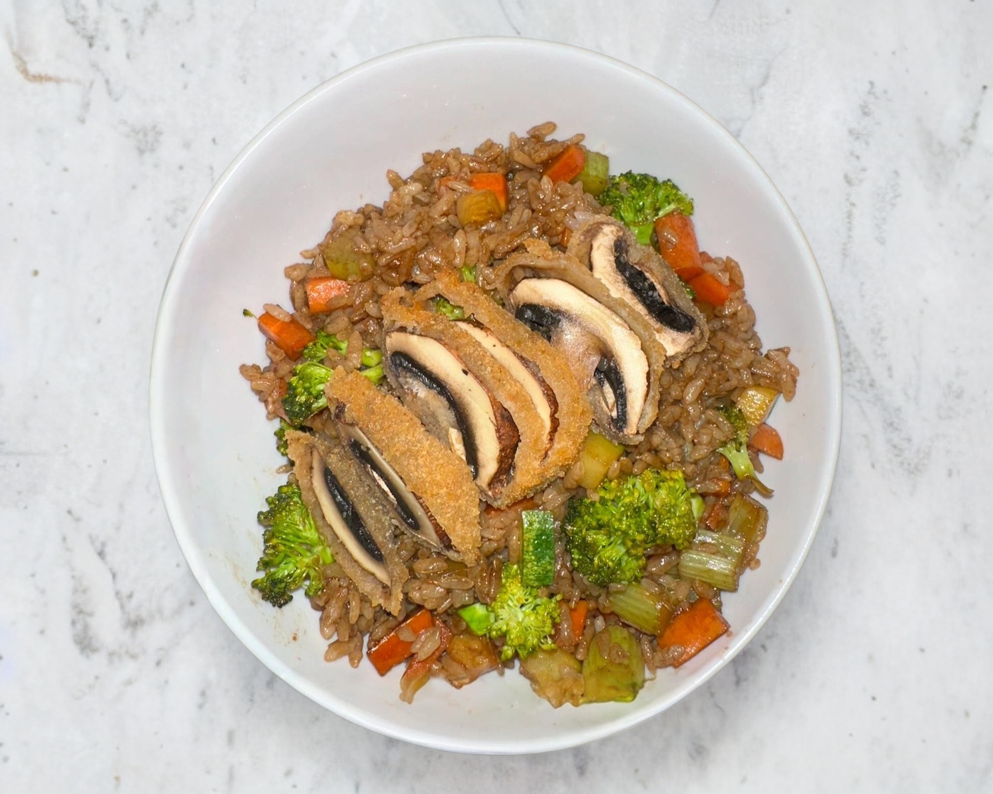 Arroz frito; mezclado con calabaza, zanahoria, apio, brócoli y un champiñón empanizado.