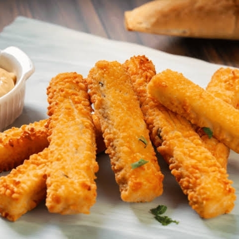 5 Piezas de palitos de queso mozzarella fritos y dorados.