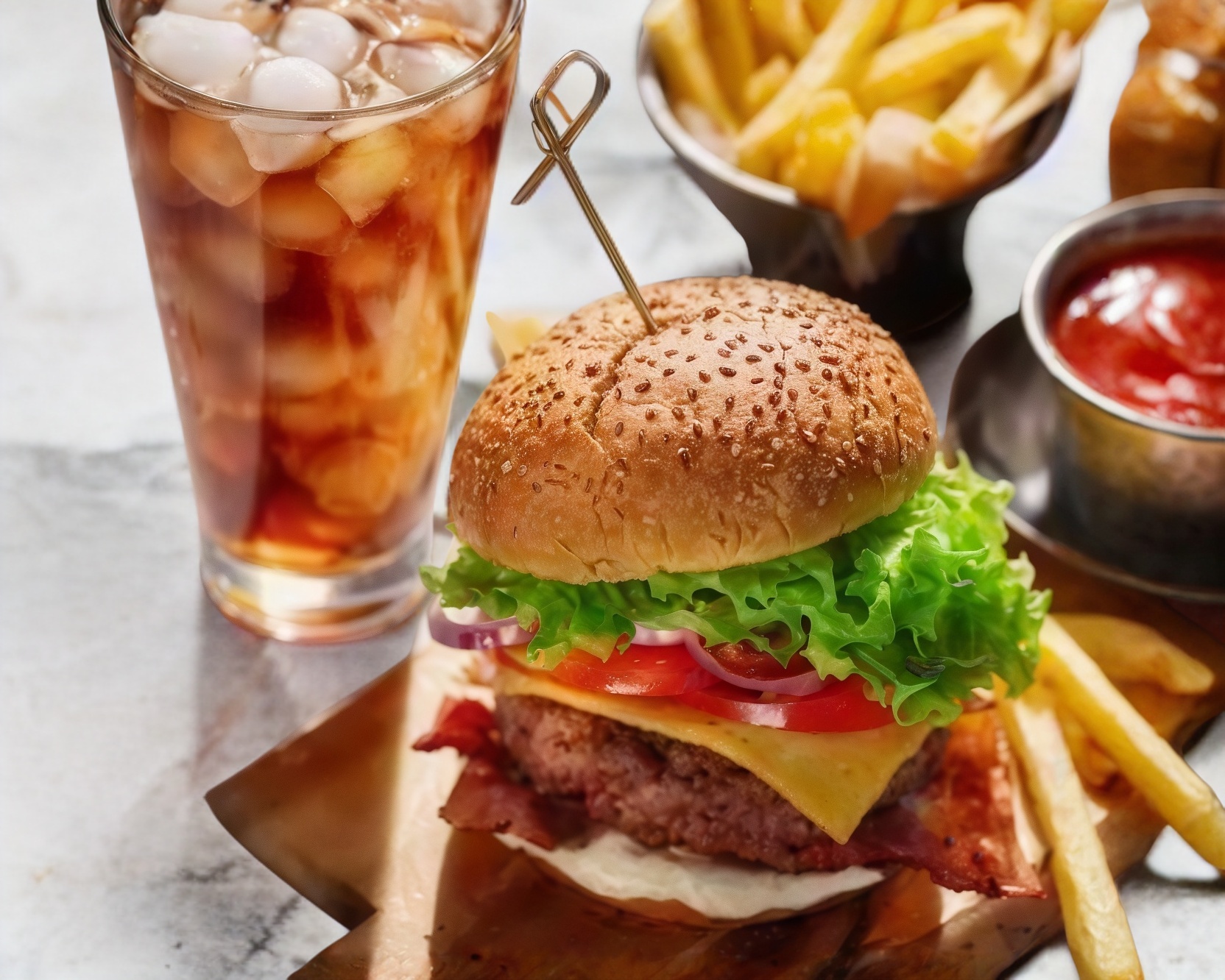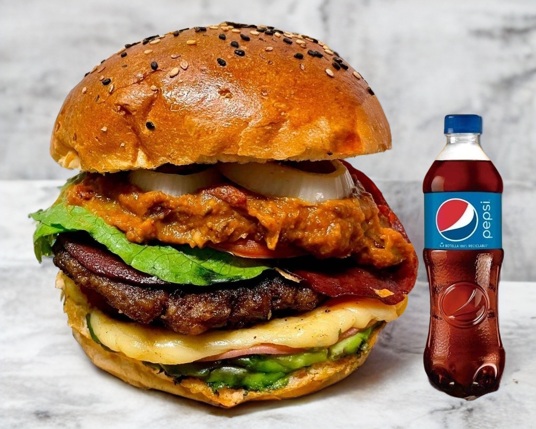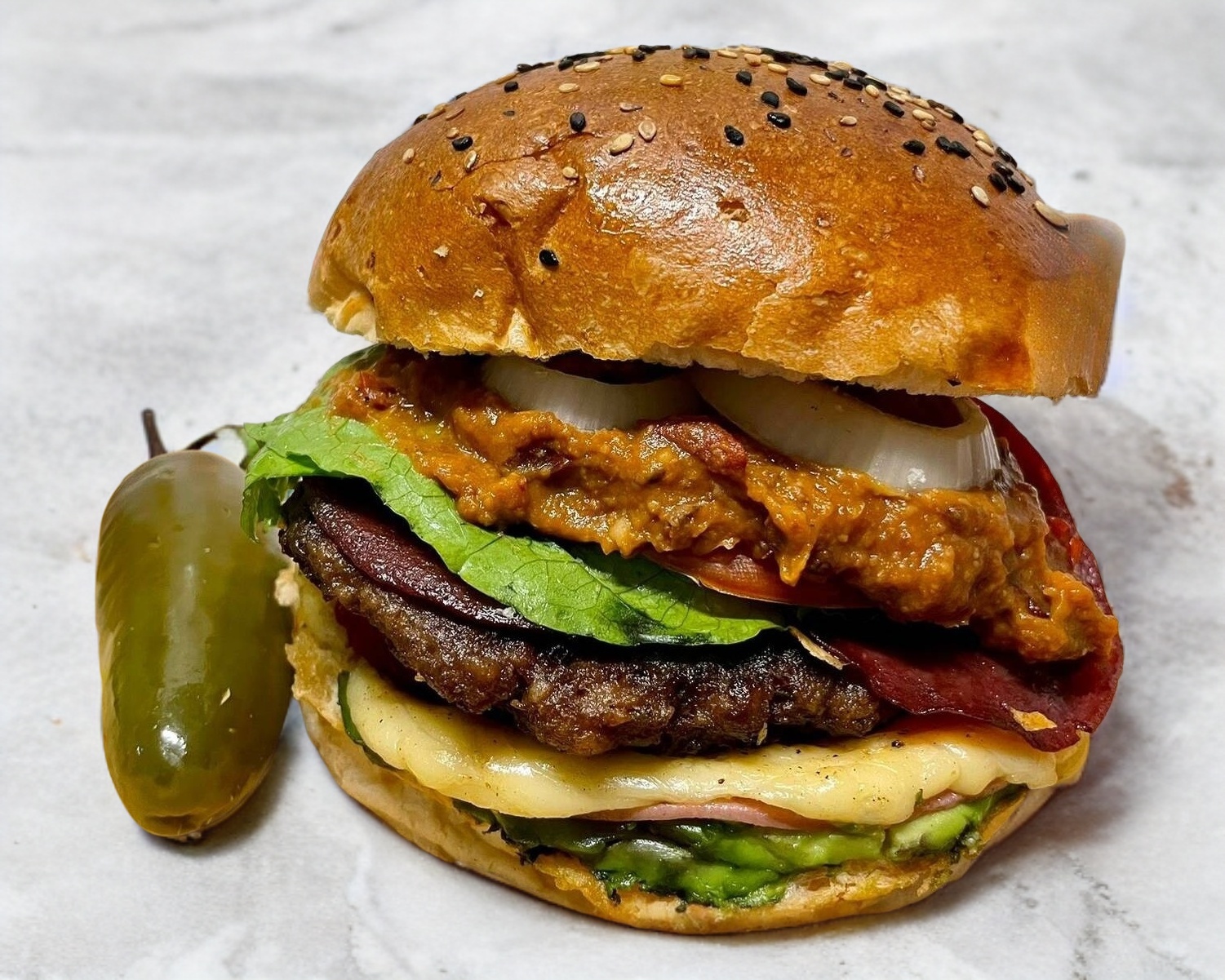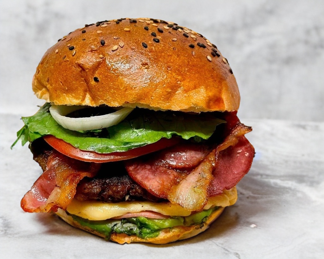 Lleva los ingredientes de la burger clásica, carne de res, jamón, salami, lechuga, tomate, cebolla, aguacate, mayonesa, mostaza y cátsup, tocino y BBQ.