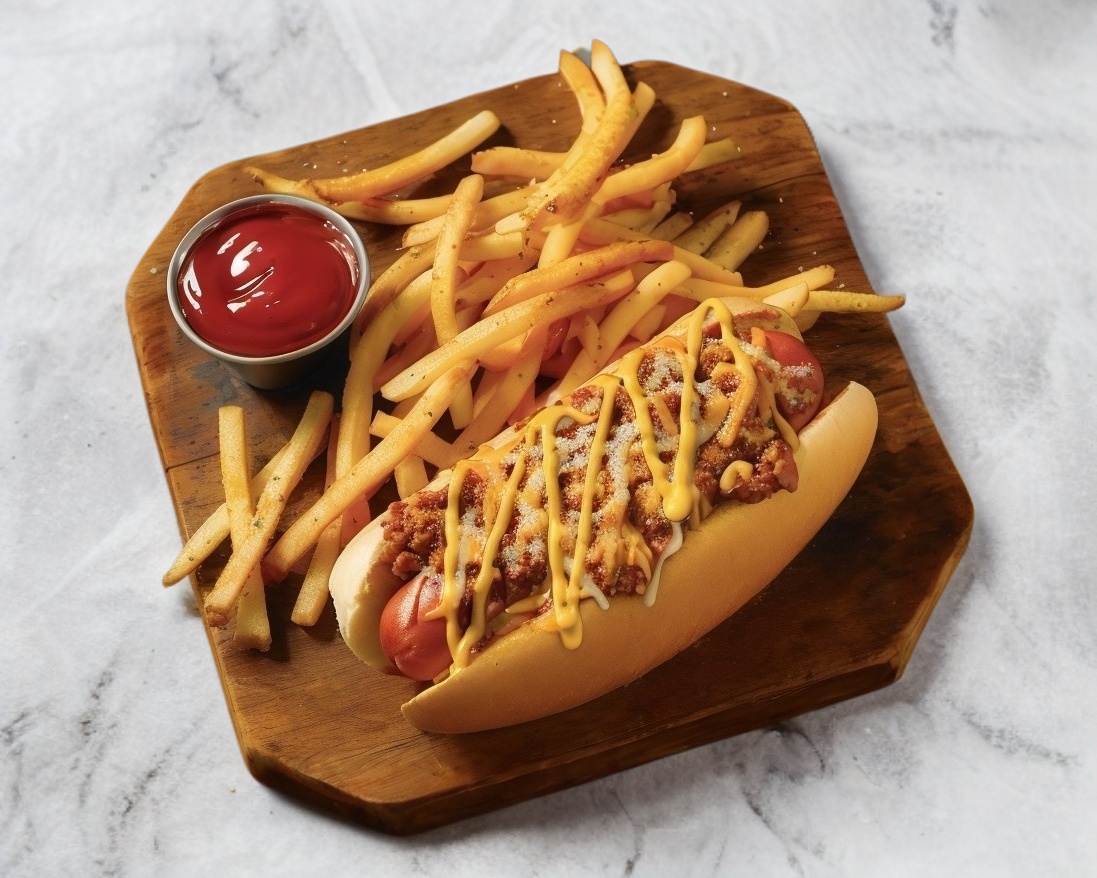 salchicha jumbo de pavo, pan con ajonjoli, mayonesa, mostaza, catsup, queso amarillo, tocino deshidratado, pepinillos, tomate, cebolla y frijoles con chipotle