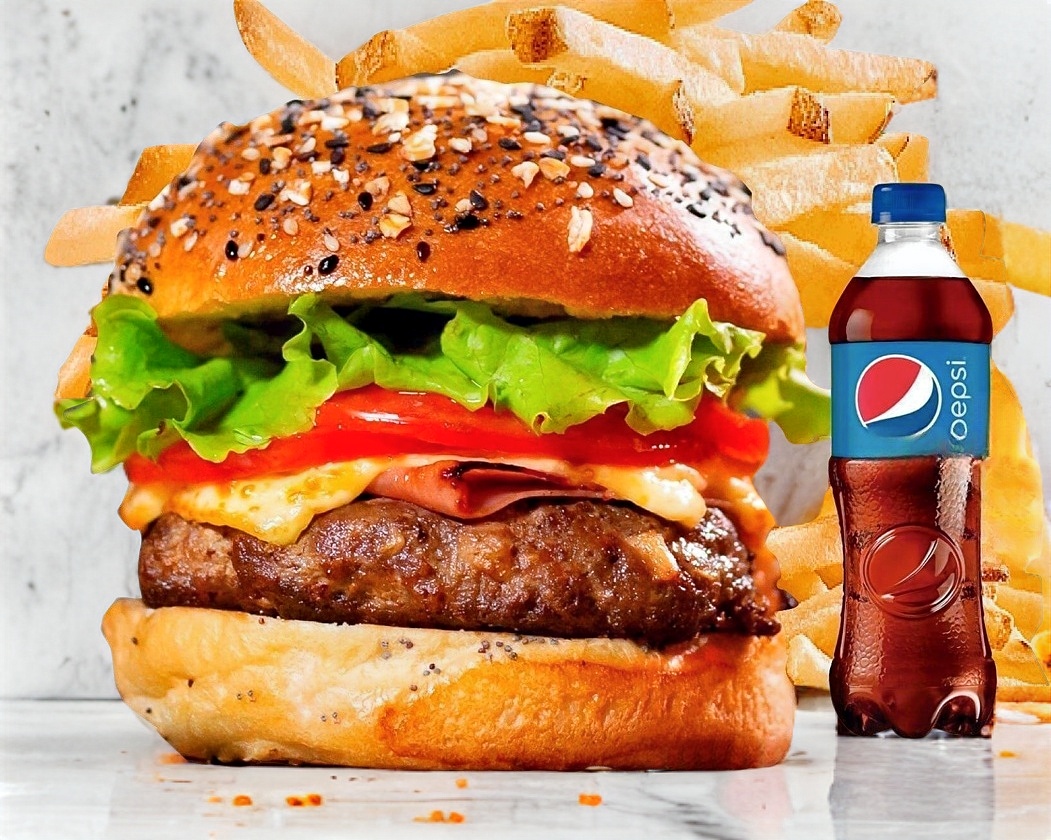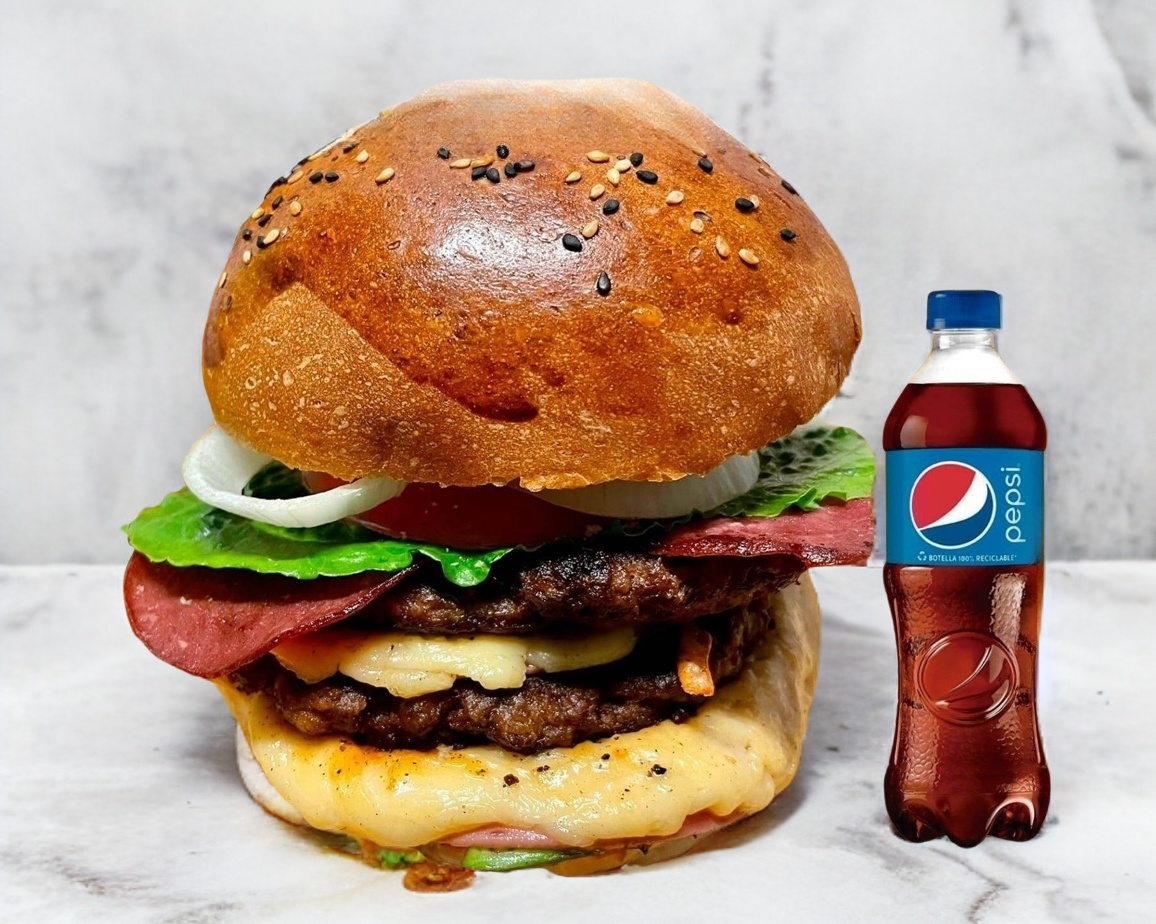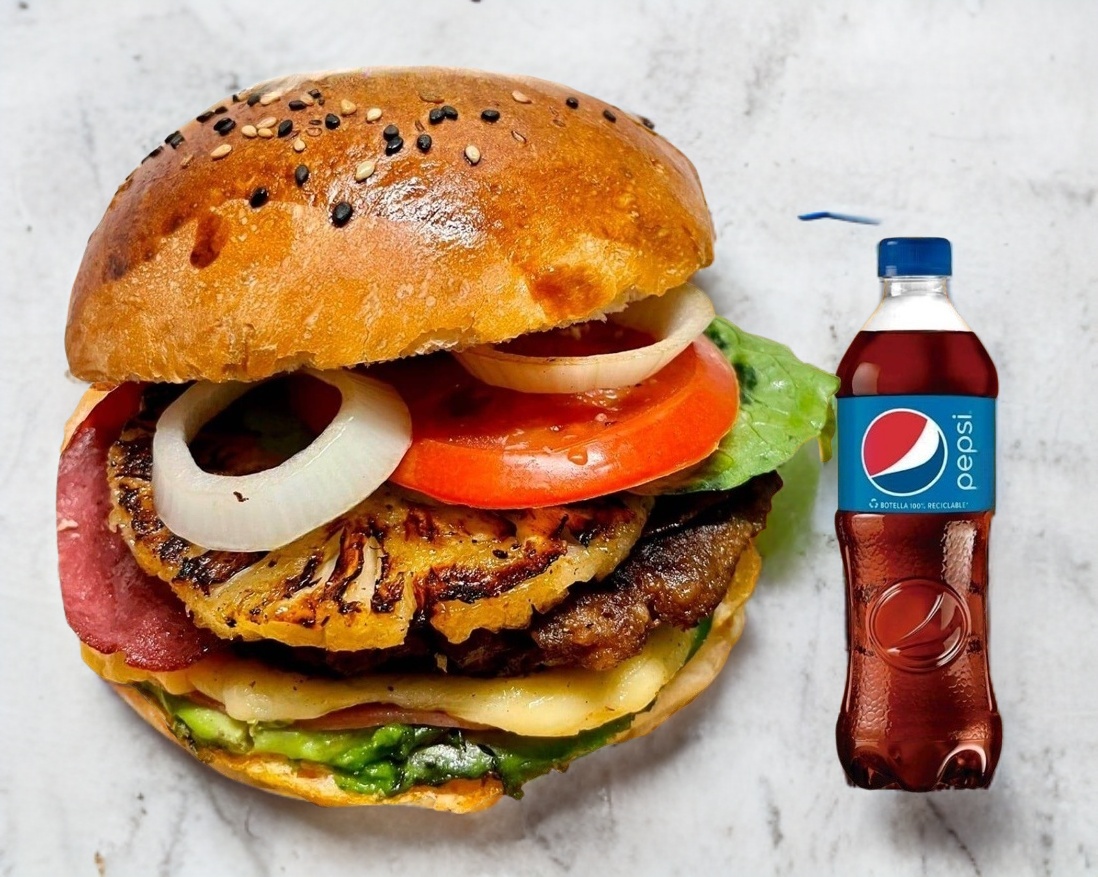Lleva los ingredientes de la burger clásica, carne de res, jamón, salami, lechuga, tomate, cebolla, aguacate, mayonesa, mostaza y cátsup, con doble carne, doble queso y doble jamón.