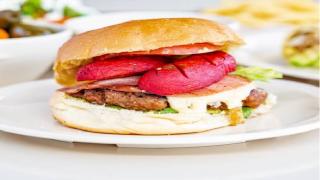 Pan recién hecho, carne de res, jamón, aguacate, queso asadero y amarillo, lechuga, tomate y aderezo.