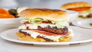 Pan recién hecho, doble carne de res, doble jamón, doble queso asadero y amarillo, lechuga, tomate, aguacate, cebolla y aderezo.