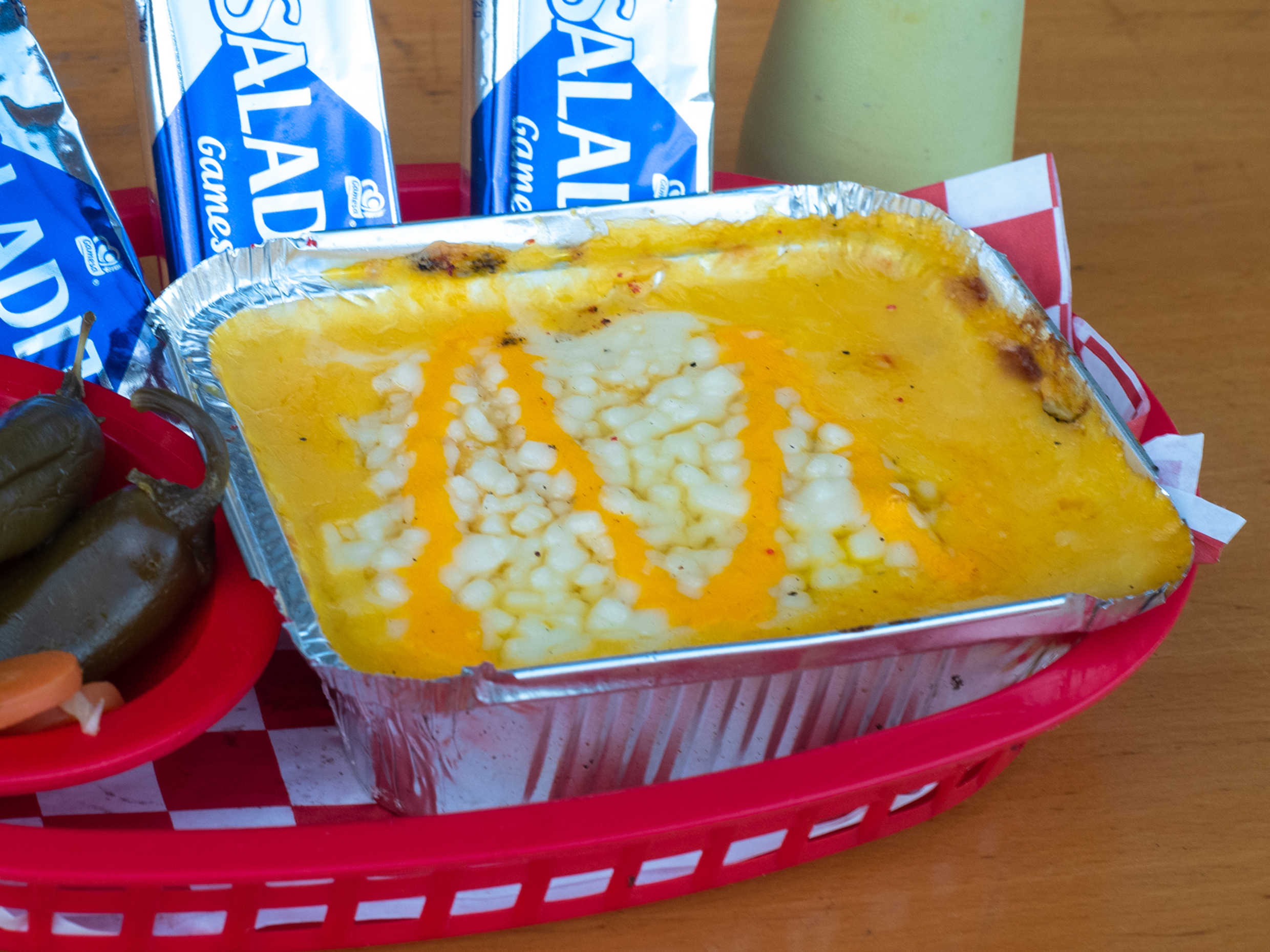 Con queso derretido y queso cheddar.