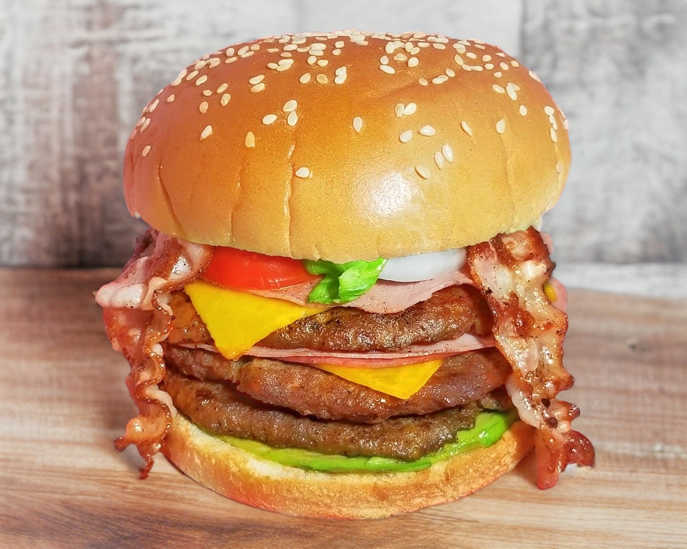 3 Carnes, tocino, queso amarillo, jamón, salami, aguacate, lechuga, tomate, cebolla, pepinillos, aderezos ( cátsup, aderezo, mostaza).