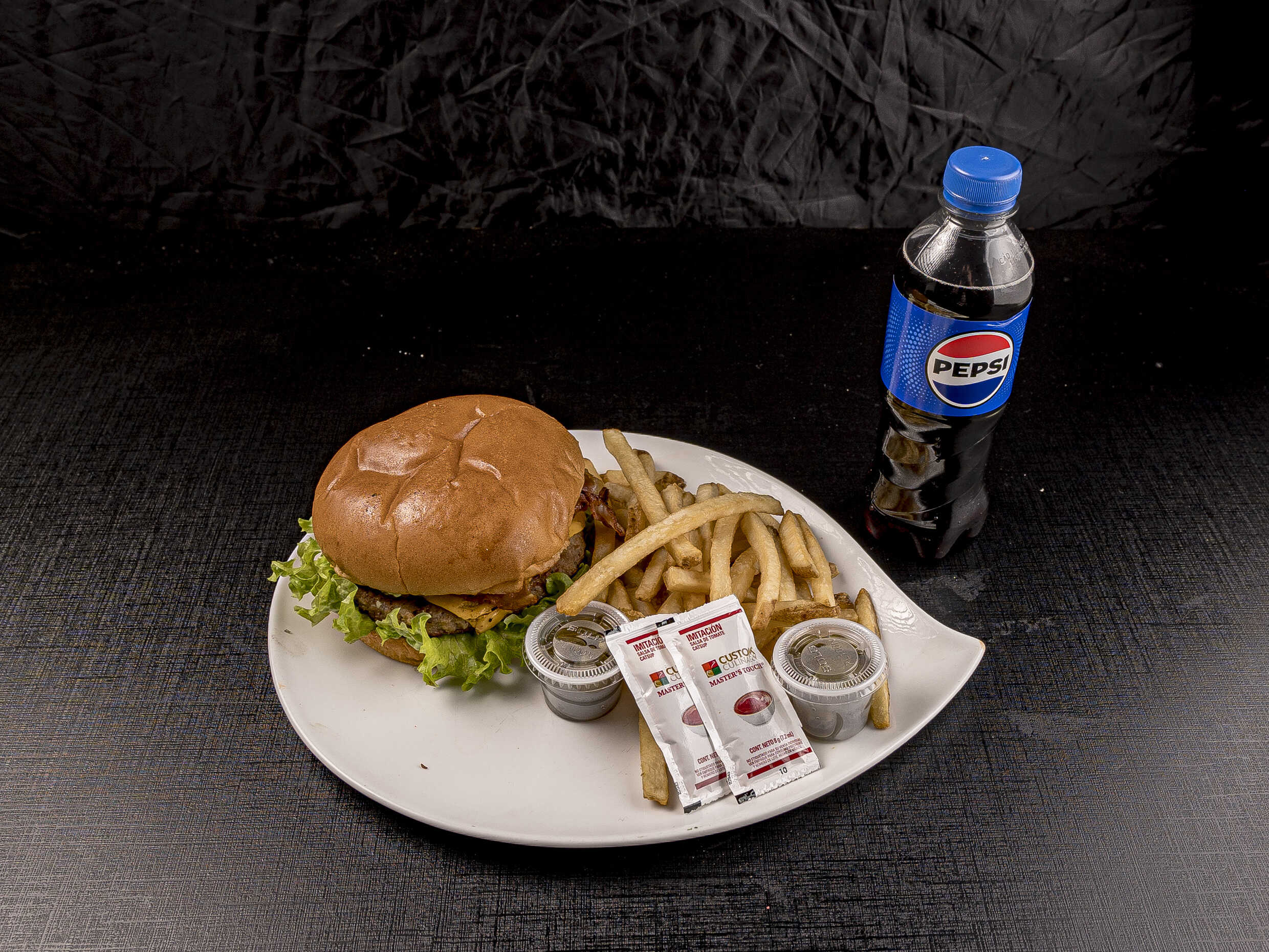 Exquisita carne de 180 gramos asada en leña de mezquite con un toque ahumado, con aderezos de la casa, pan brioche, verdura, con 60 grms de papas a la francesa, refresco de 355 ml