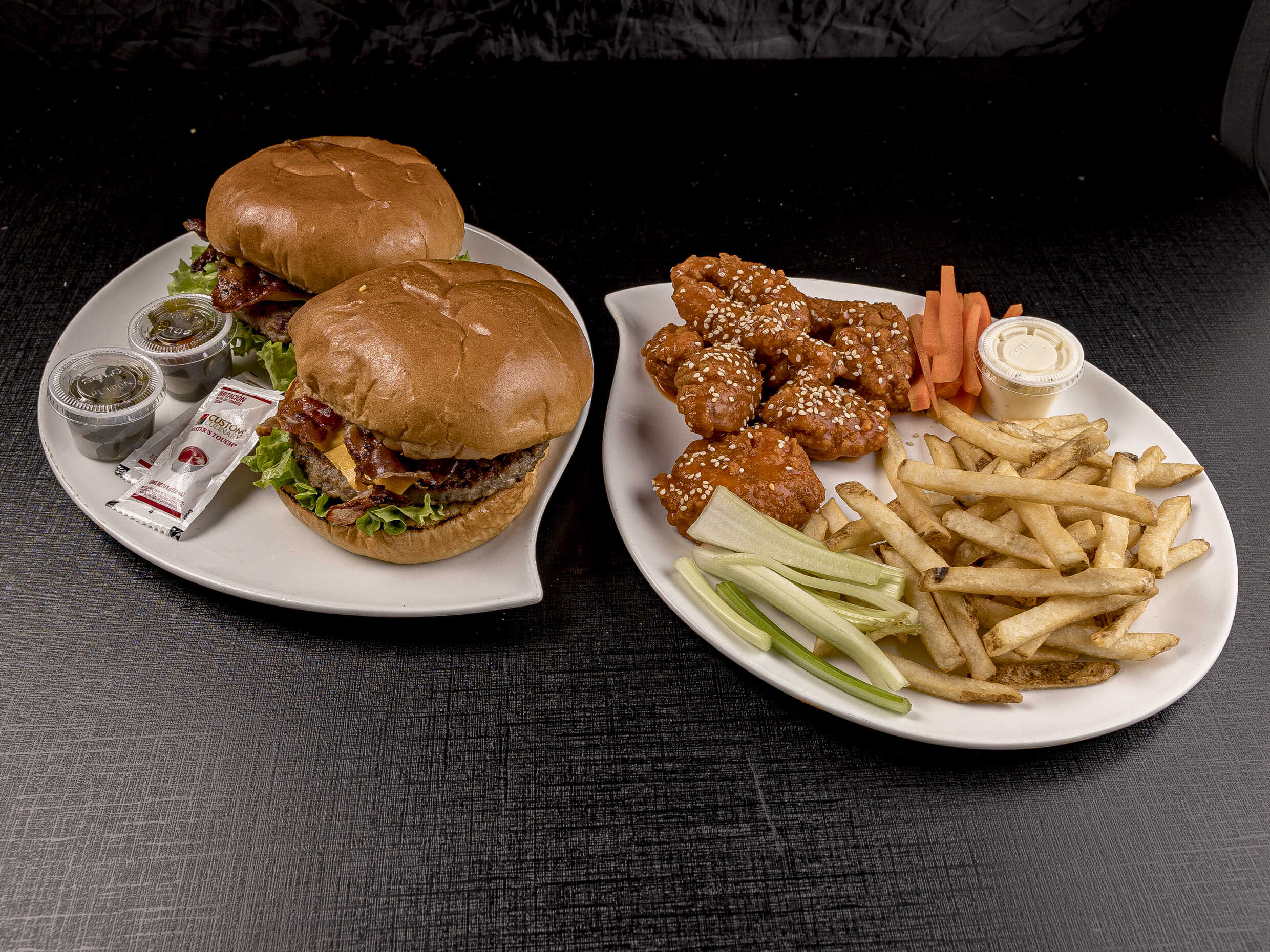 2 Hamburguesas austin, french fries, 10 boneles bañados en la salsa de tu eleccion, aderezo ranch, mix de verdura.