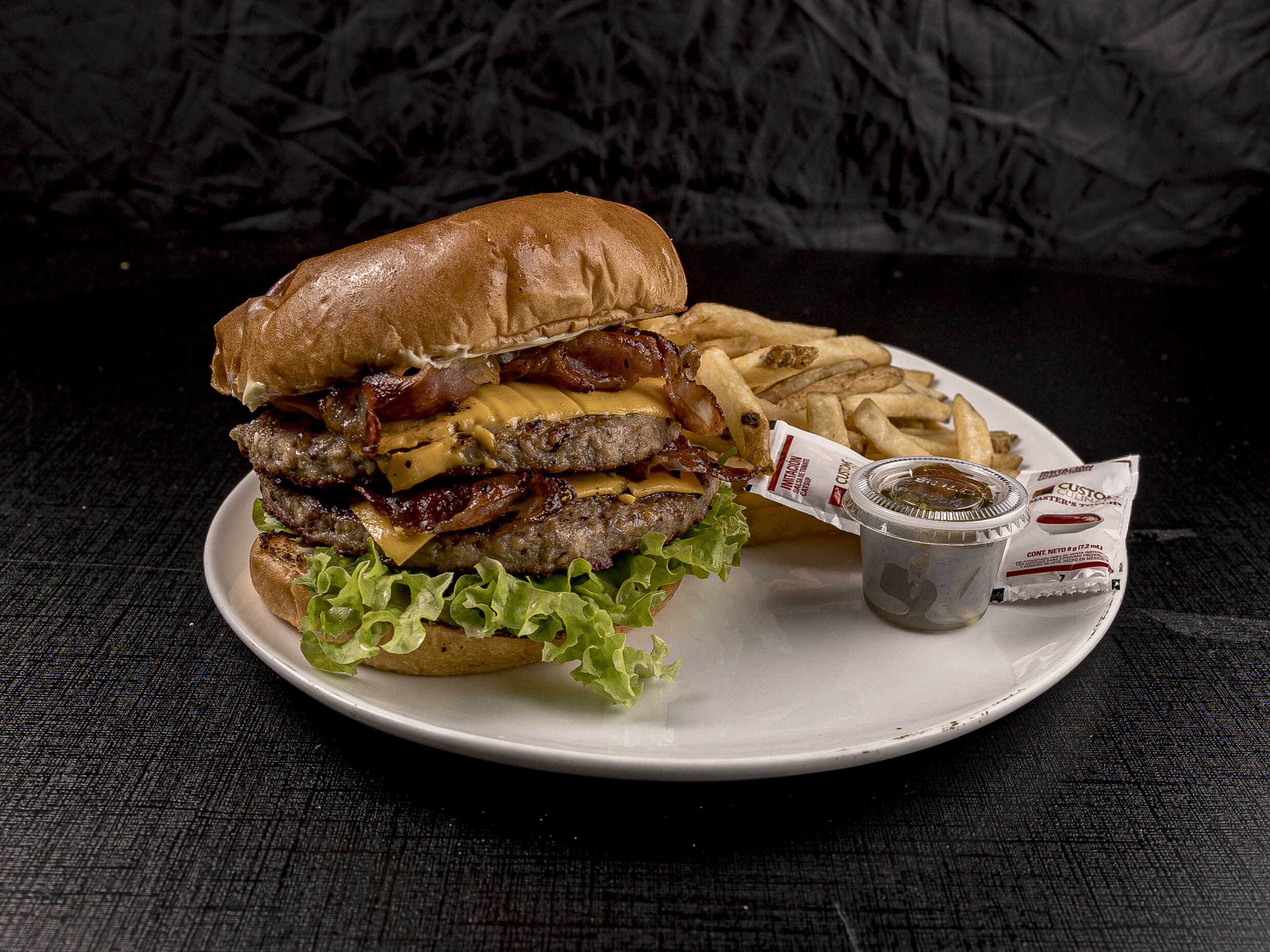 360 Gramos de jugosa carne, doble queso, lechuga, tomate, tocino, aderezo