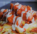 Deliciosa pizza de 12 ", de boneless en salsa búfalo butter, con orilla rellena de queso mozzarela, delineada con aderezo ranch, y al centro french fries con lineas de queso cheddar.