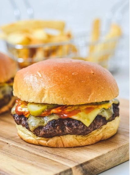 Hamburguesa con carne 100% res, queso americano, tomate, aderezo pepinillo.