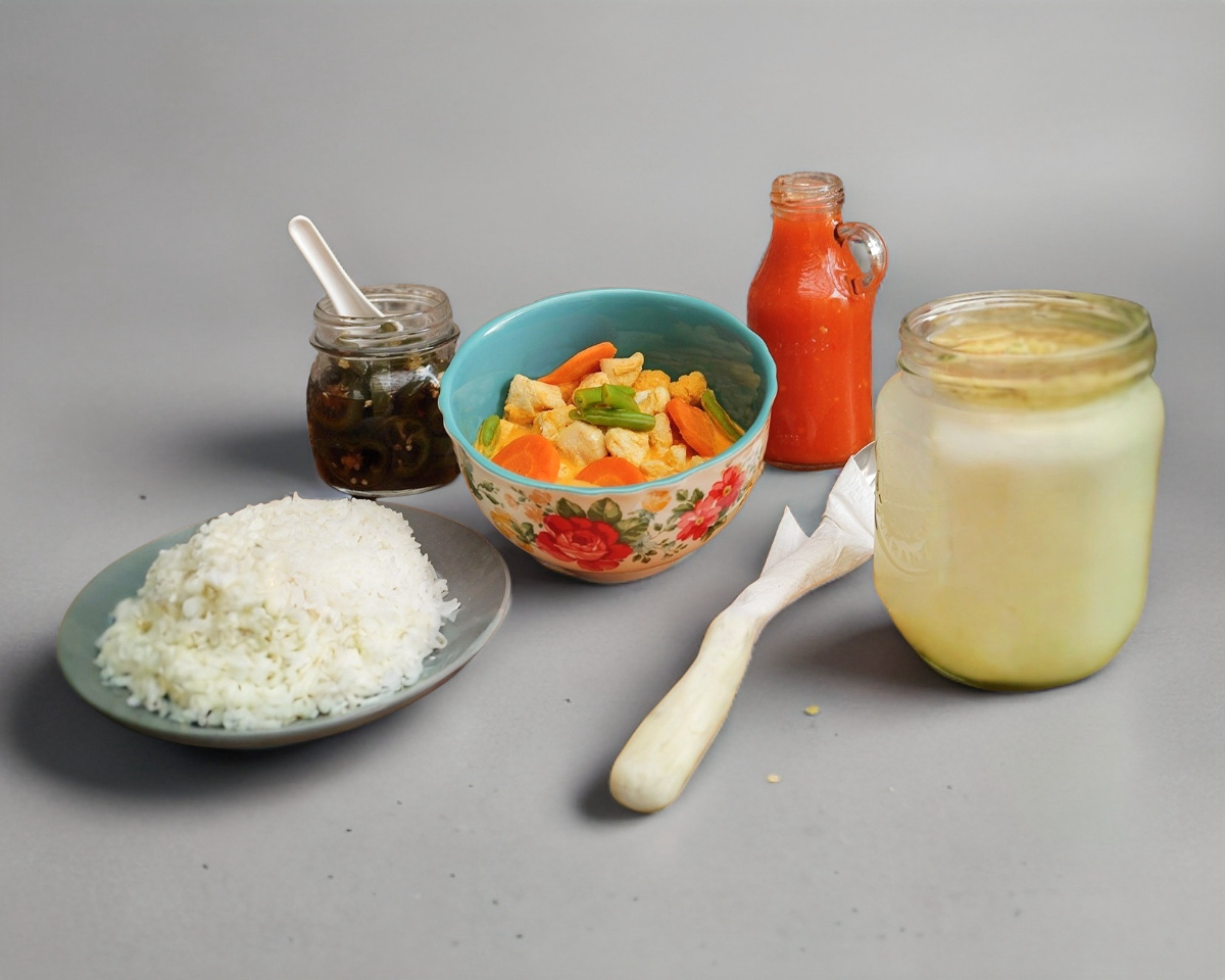 Pechuga de pollo, tofu o extra vegetales, acompañado de papa y zanahoria bañado en una cremosa salsa de curry cacahuate. (Tailandes).