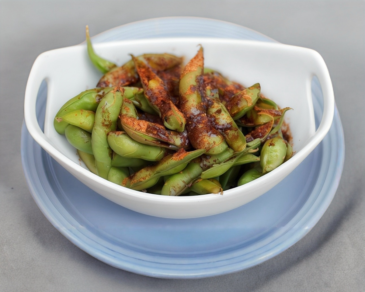 Edamames al vapor bañados en salsa de soya cítrica con un toque picante.