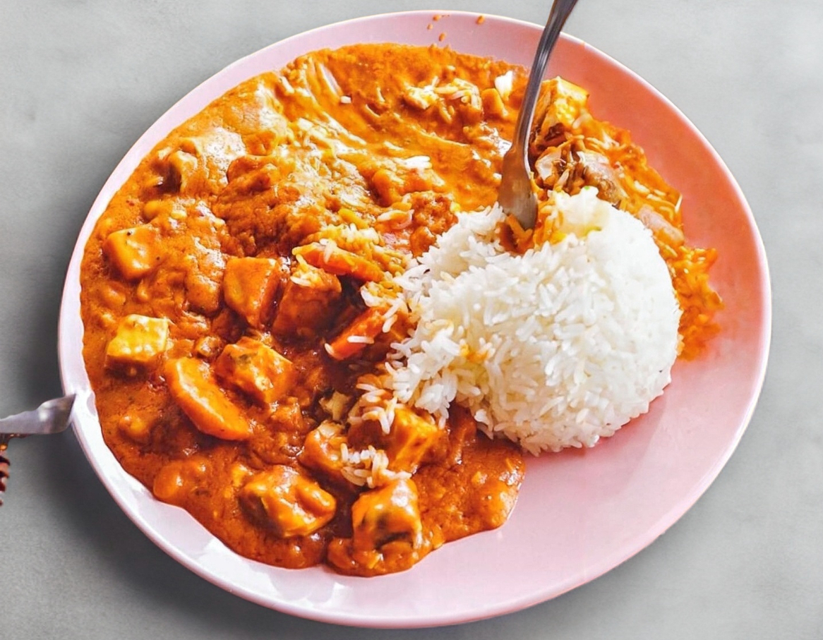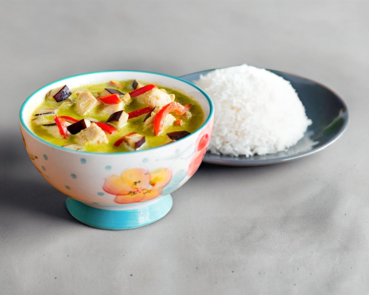 Pollo, berenjenas y pimiento rojo en una crema de coco herbal y picante.