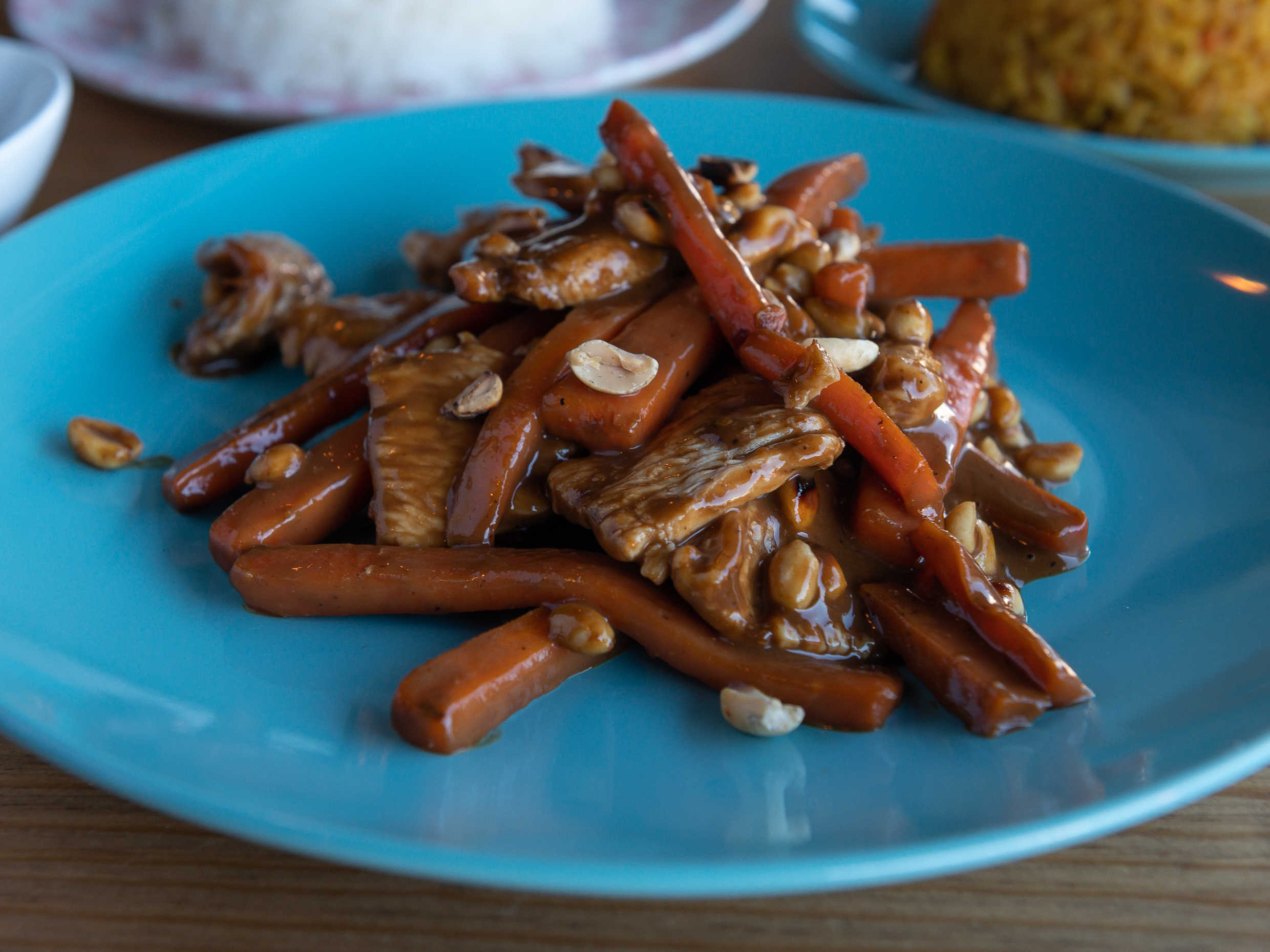 Pechuga de pollo y zanahoria mezclados con nuestra salsa especial agridulce de cacahuate y naranja. Acompañado de arroz jazmín al vapor o arroz frito estilo thai (piña y cacahuate).
