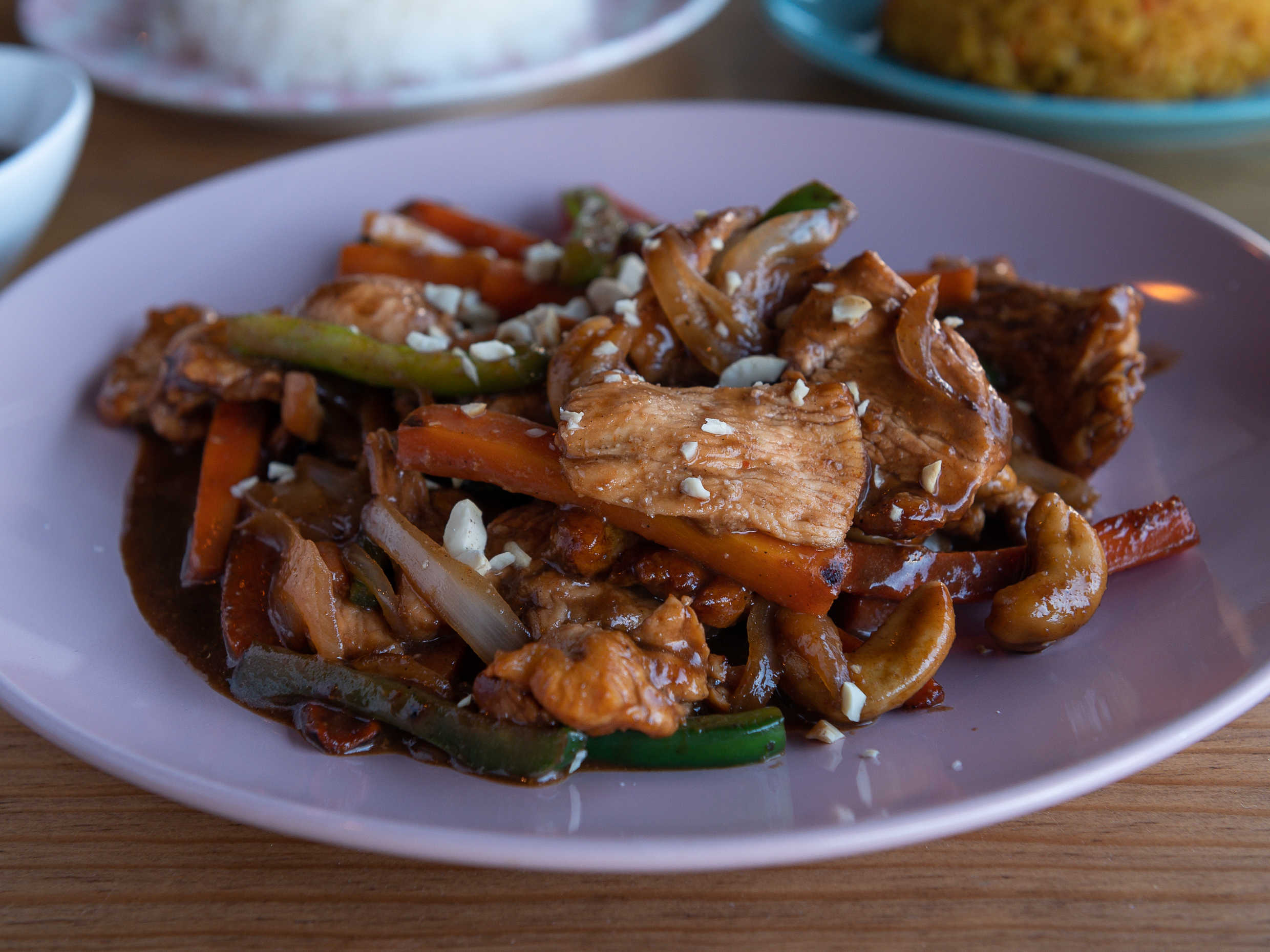 Pechuga de pollo ligeramente empanizada, zanahoria, pimiento verde, cebolla caramelizada y nuez de la india, salteadas en una salas estilo tailandés, acompañado de arroz jazmín al vapor o arroz frito estilo thai (piña y cacahuate).