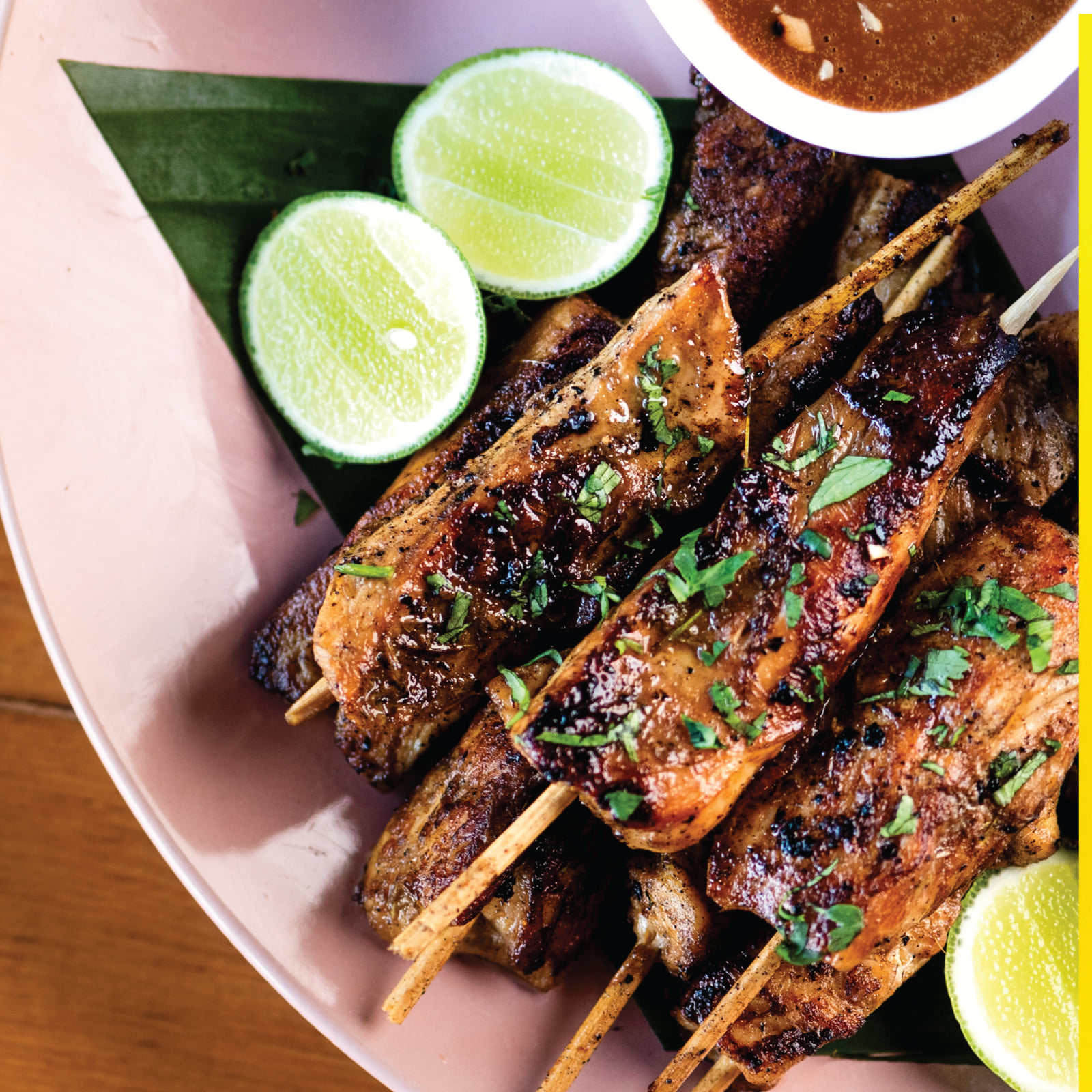 Brochetas de pollo marinados en curry con aderezo de cacahuate.