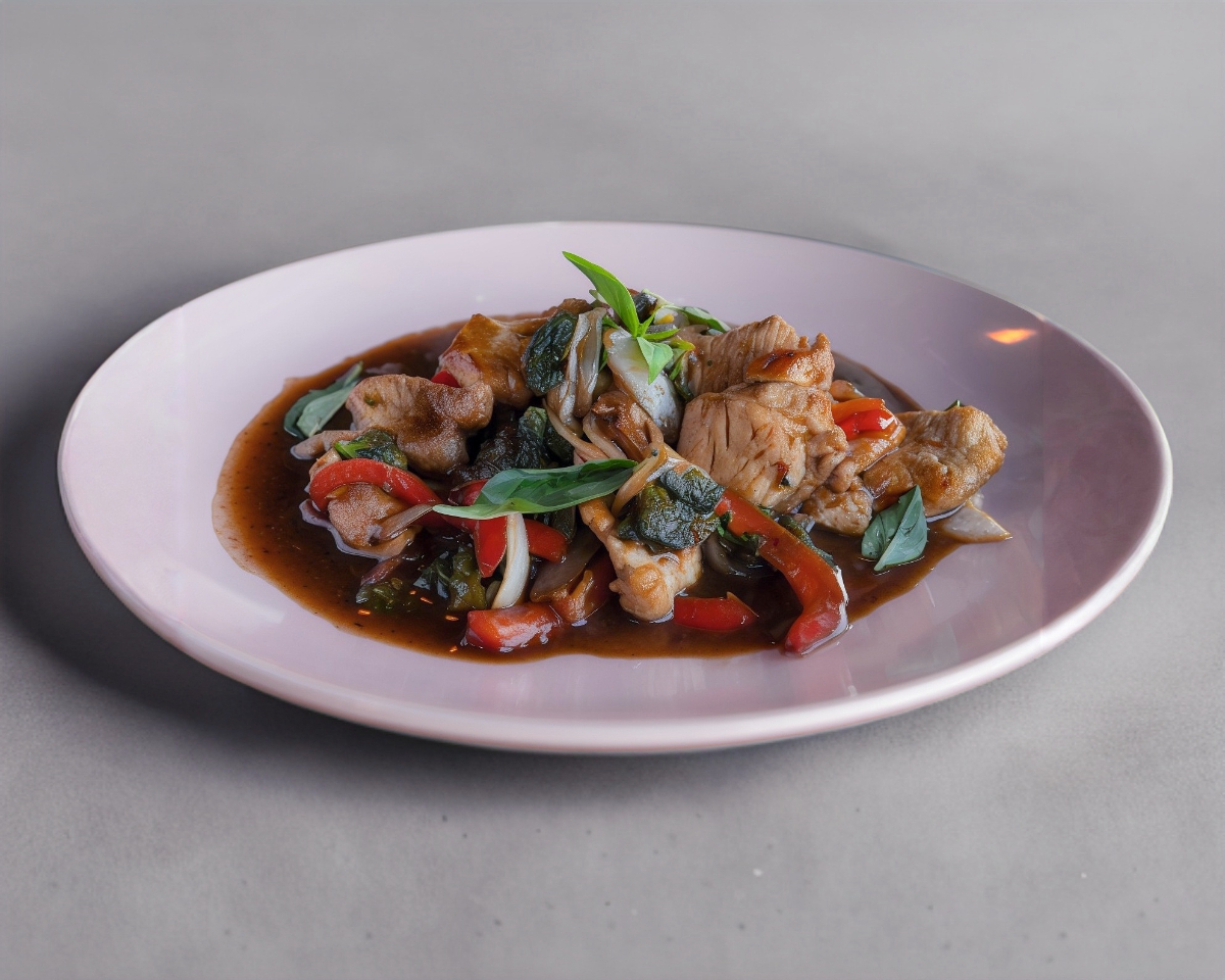 Pechuga de pollo, brócoli, pimiento rojo y verde, cebolla y albahaca fresca. Preparado con salsa de soya y ostión. Acompañado de arroz jazmín al vapor o arroz frito estilo thai (piña y cacahuate).