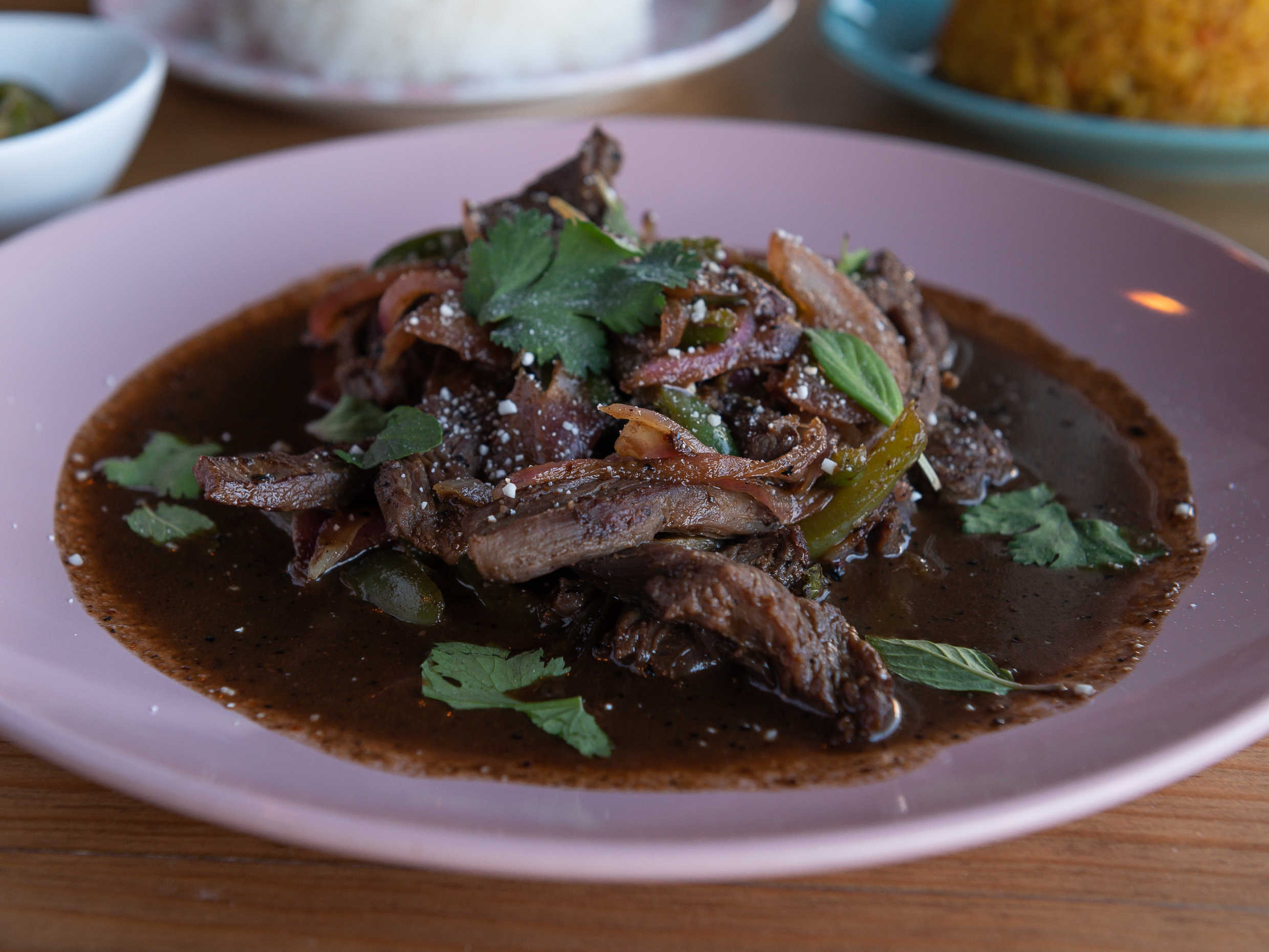Carne de res combinada con cilantro, menta, pimiento verde, cebolla morada y una salsa cítrica tailandesa. Acompañado de arroz jazmín al vapor o arroz frito estilo thai (piña y cacahuate).