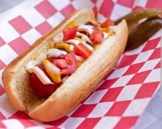 Hot Dog Polaco ahumada acompañado con queso nacho y tocino, aderezo y cebolla y tomate.