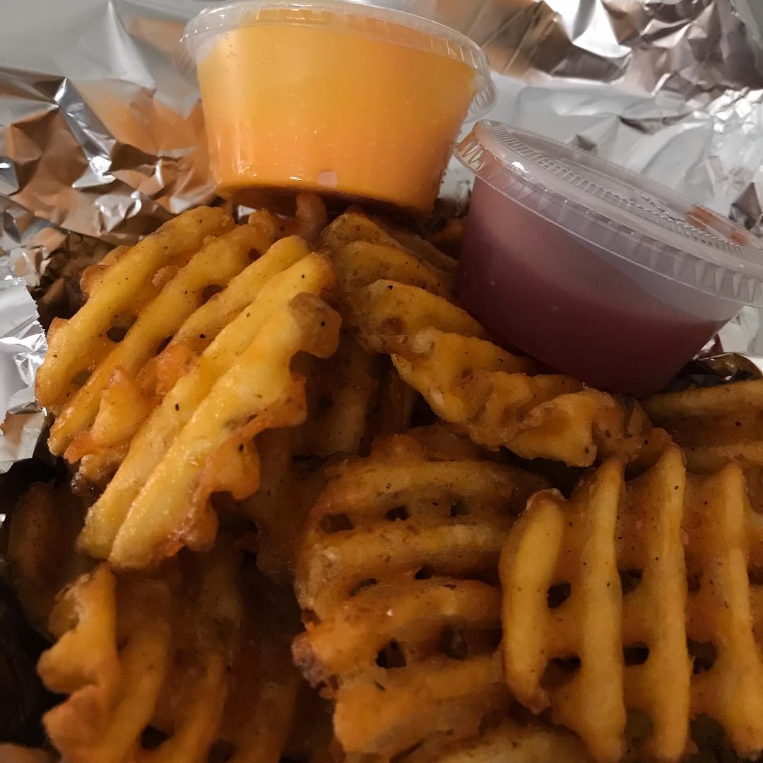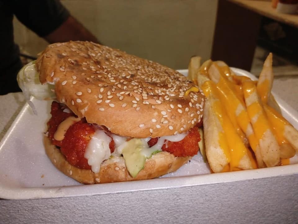 Carne de res con queso americano y jamón radaja de piña, papas fritas con lemon pepper.